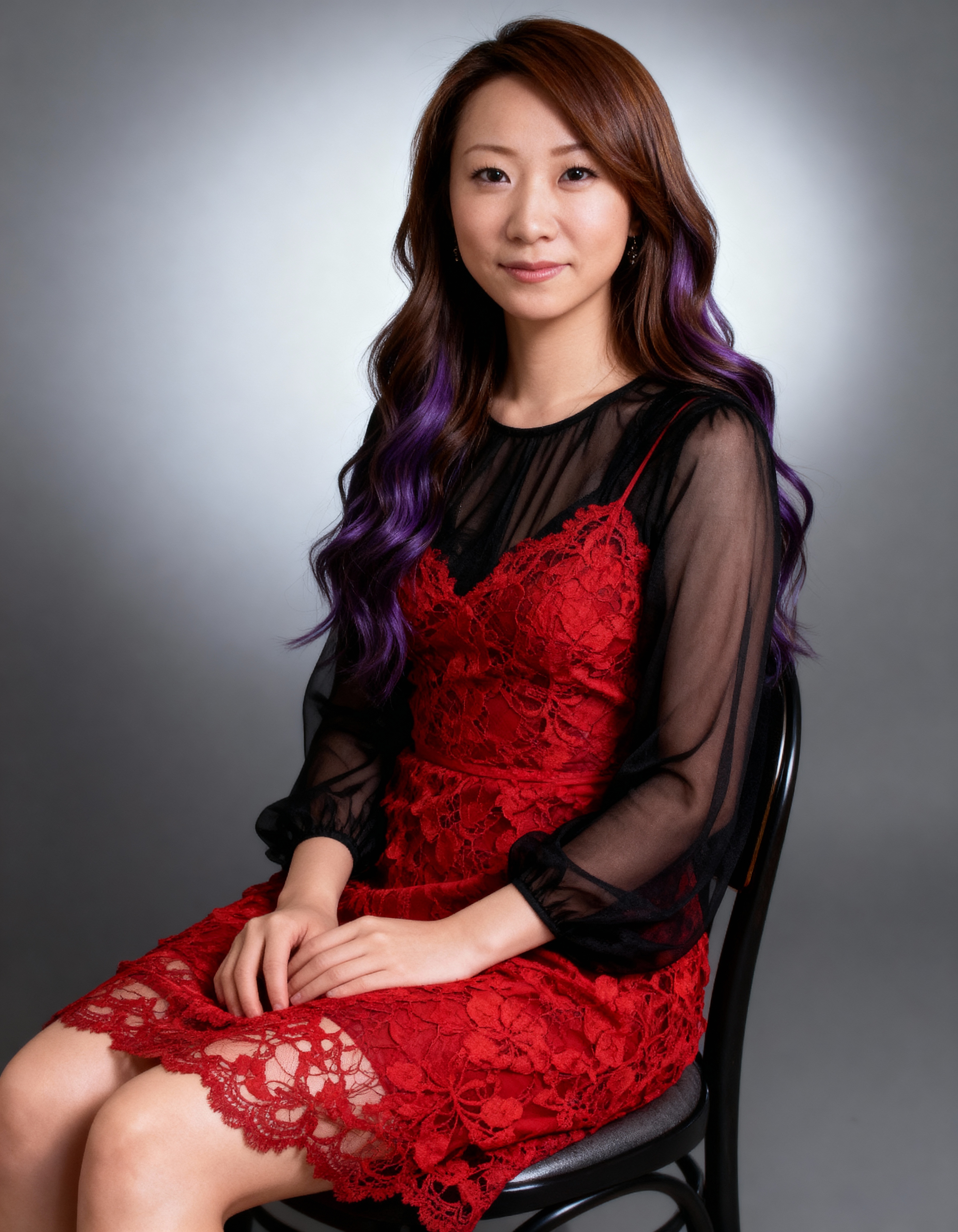 灰色の背景に黒い椅子に座っている、赤いレースのドレスを着た長くウェーブのかかった髪の若い女性のポートレートを、ポートレート カメラの角度から撮影したプロのポートレート。この画像には、彼女の背後にある柔らかくぼやけた光源も示されており、劇的な効果を生み出しています。画像の中央では、16 歳の女性が前で手を握り、自信に満ちた笑みを浮かべているように見えます。彼女は薄手の黒いトップと、彼女の体型を強調する赤いレースのドレスを着ています。彼女の髪は紫のハイライトが入ったロングストレートのスタイルでスタイリングされており、目は中性的な表情でカメラをまっすぐに見つめています。彼女の体はスリムで、姿勢はリラックスしていて自信に満ちています。全体的な雰囲気はプロフェッショナルで洗練されています。