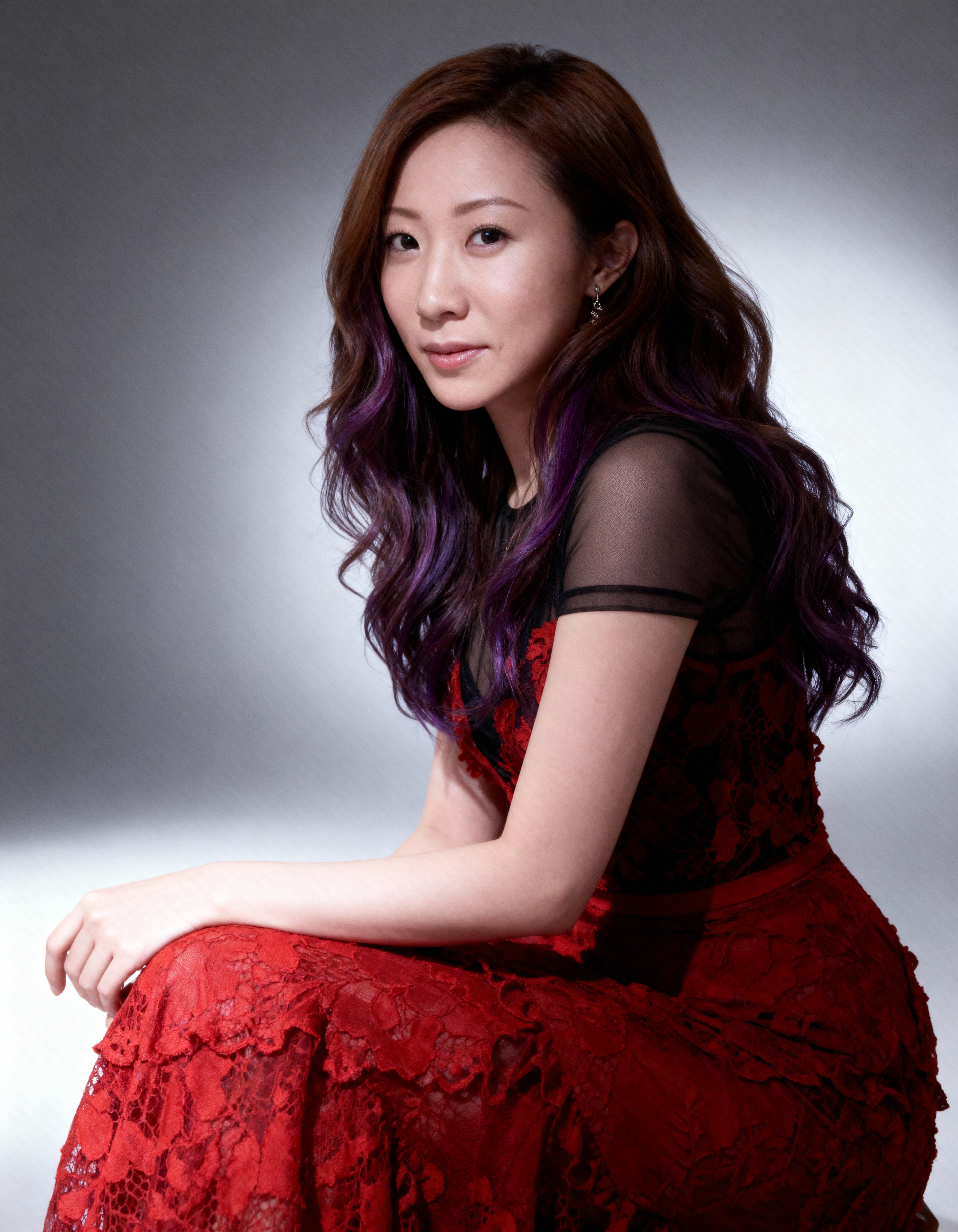 赤いレースのドレスを着て、グラデーションの背景に対して瞑想的なポーズで座っている、ウェーブのかかった長い髪の女性のポートレートを、ポートレート カメラの角度から撮影したものです。 20代半ばと思われる女性は、中性的な表情をしており、わずかな笑みを浮かべてカメラをまっすぐに見つめています。彼女は、紫のハイライトが入ったダークブラウンの髪をゆるいウェーブにスタイリングし、彼女の曲線を強調する薄手の黒いレースのドレスを着ています。ドレスはフィットしたボディスと膝のすぐ上にあるフレアスカートで、魅力的なシルエットを作り出しています。照明は柔らかく拡散し、彼女の特徴を強調し、肌に微妙な輝きを生み出します。イメージ全体の雰囲気は洗練され、エレガントで、女性のエレガントで洗練された外観に焦点を当てています。
