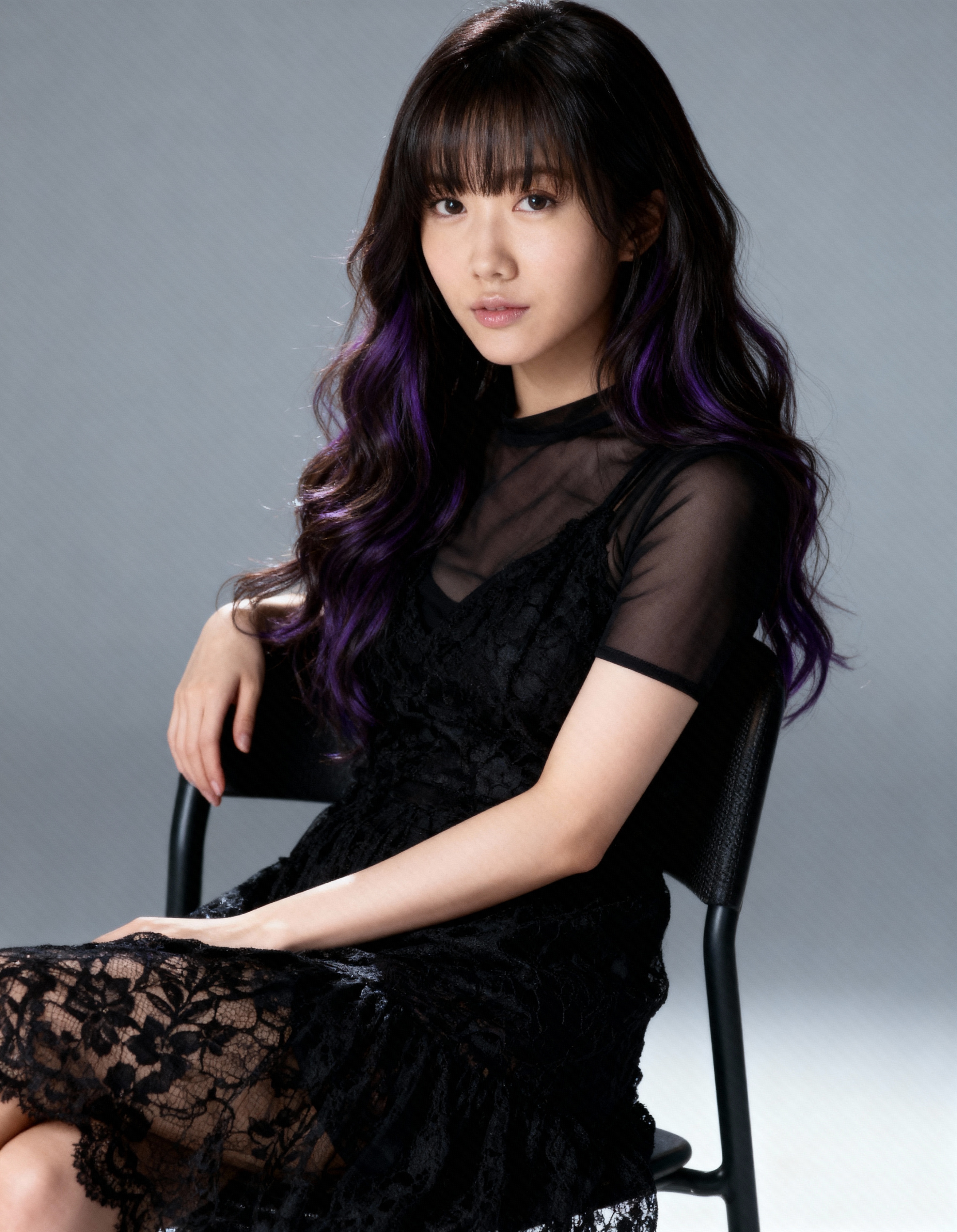 ミニマルなグレーの背景に黒い椅子に座る、紫のハイライトが入った長くウェーブのかかった黒髪の若い女性をポートレート角度から撮影した写実的なポートレート。画像には、フレームの中央に座っている、薄手の黒いレースのドレスを着た女性も写っています。女性は10代後半か20代前半のように見え、肌は白く、中性的な表情をしており、口元にわずかな笑みを浮かべてカメラをまっすぐに見つめています。彼女の髪は前髪のあるロングストレートカットで、目は印象的な茶色です。最小限のメイクと最小限のアクセサリーで、椅子に手をついてリラックスした姿勢をとっている。照明は柔らかく自然で、彼女の繊細な特徴を強調し、肌に微妙な輝きを生み出します。全体的な雰囲気は穏やかで穏やかで、女性の瞑想的な表情に焦点が当てられています。