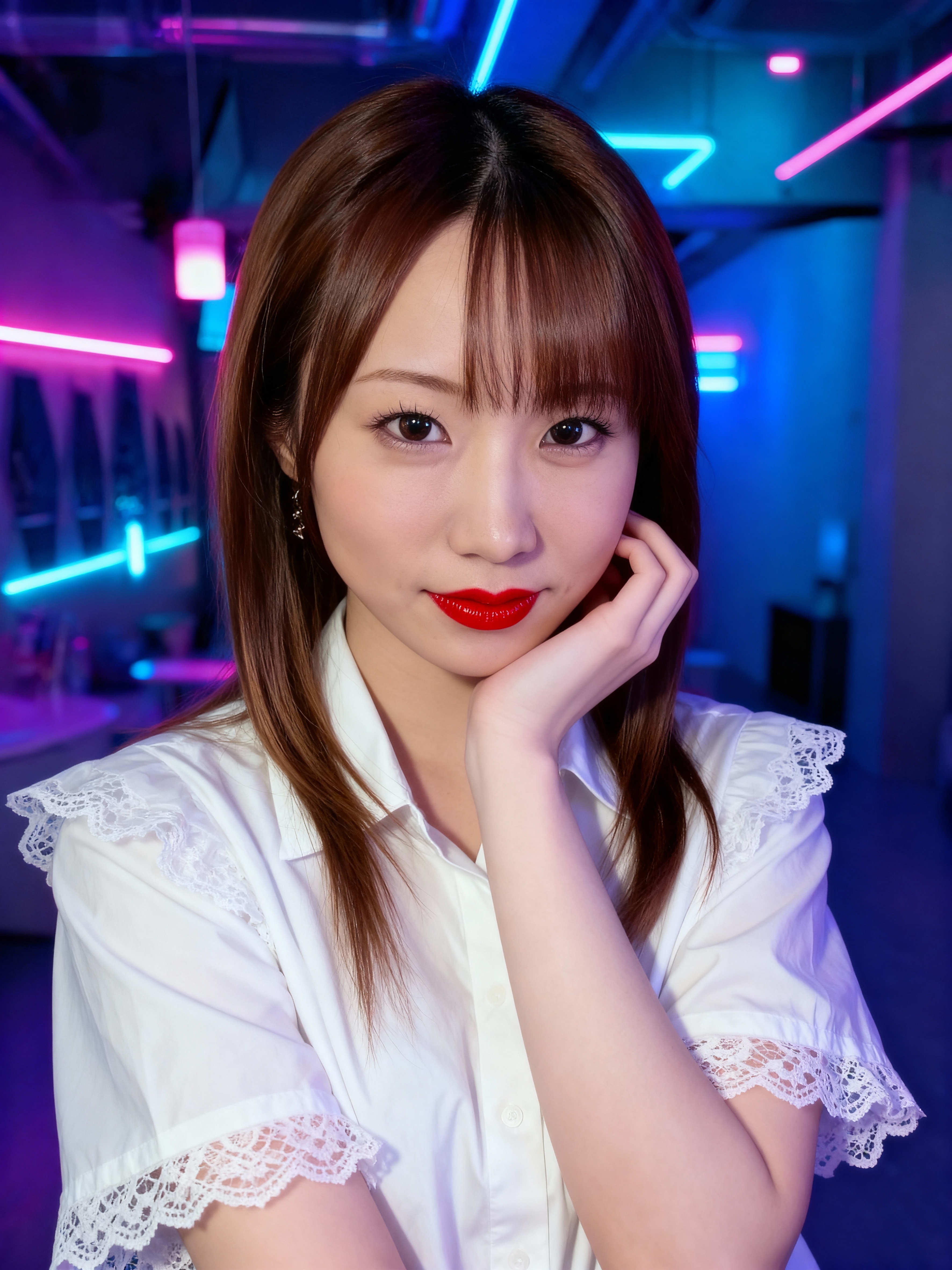 薄暗いネオンの光る部​​屋で、レースのディテールが施された白いブラウスを着て、思慮深い表情でポーズをとる若い女性を、ポートレート カメラ アングルから撮影した写実的なポートレート。画像の中央には、顎を手に乗せ、中立的な表情でカメラを直接見つめている女性も写っています。女性は十代後半のようで、長い茶色の髪と茶色の目をしており、顔にはかすかに笑みを浮かべています。彼女はスリムな体をしており、ボタンダウンの襟と半袖のレースのトリムが付いた半袖の白いシャツを着ています。髪は前髪のあるストレートスタイルで、唇には赤い口紅を塗っています。背景はぼかされ、青とピンクの色合いのネオンが輝き、活気のある雰囲気を作り出しています。照明は柔らかく温かみがあり、女性の特徴と肌の質感を強調しています。