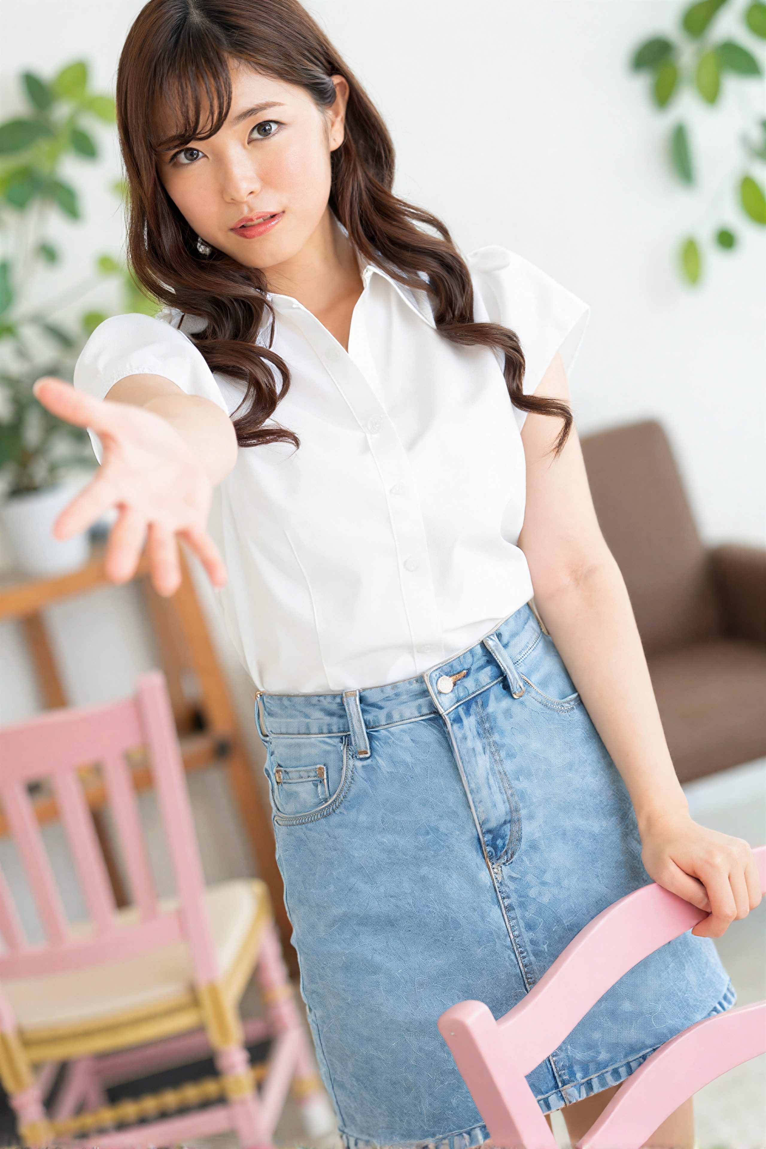 明るい部屋で優しく手を差し伸べる彼女。カジュアルな