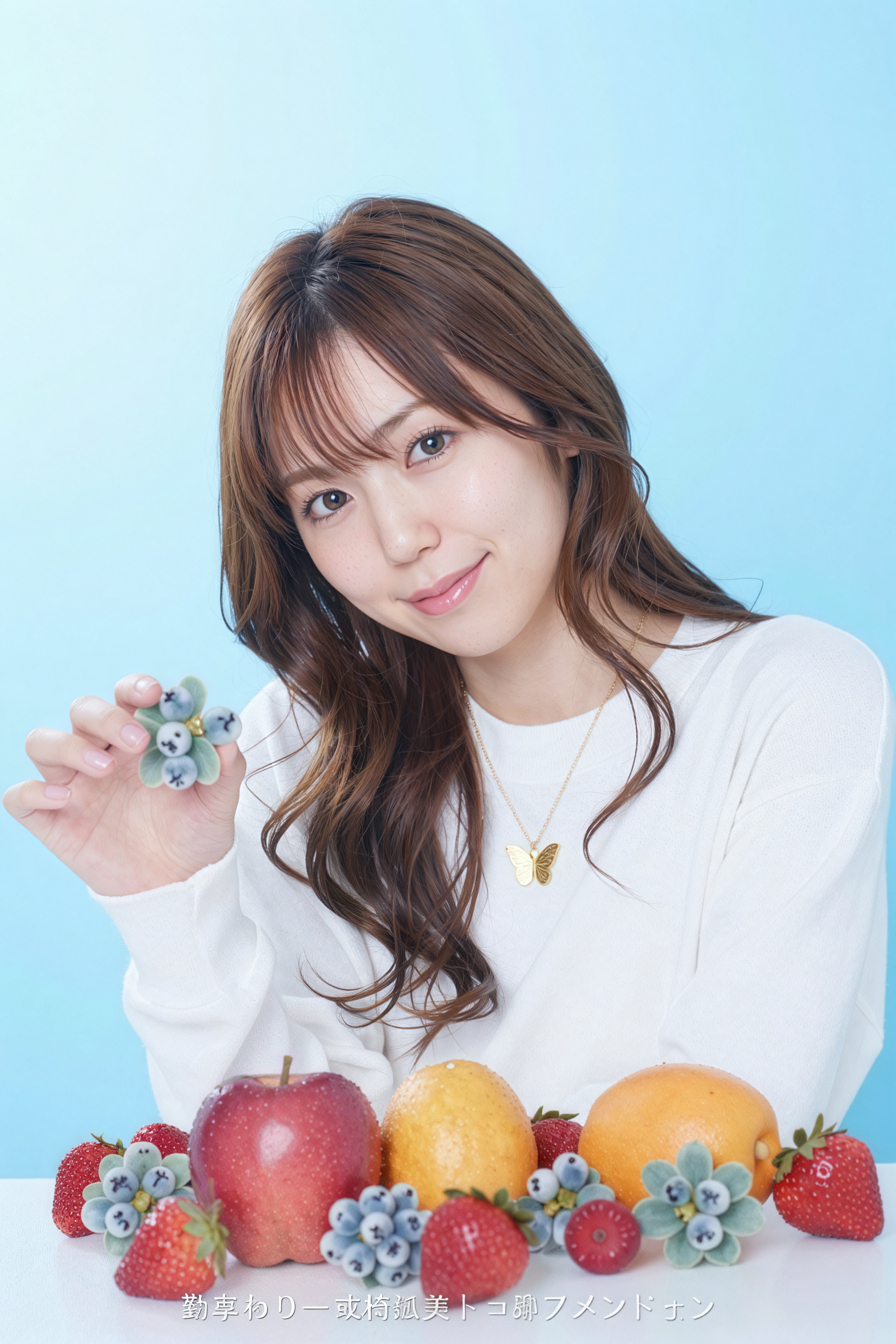 優しい笑顔でカメラを見つめる美女。色鮮やかなフルーツに