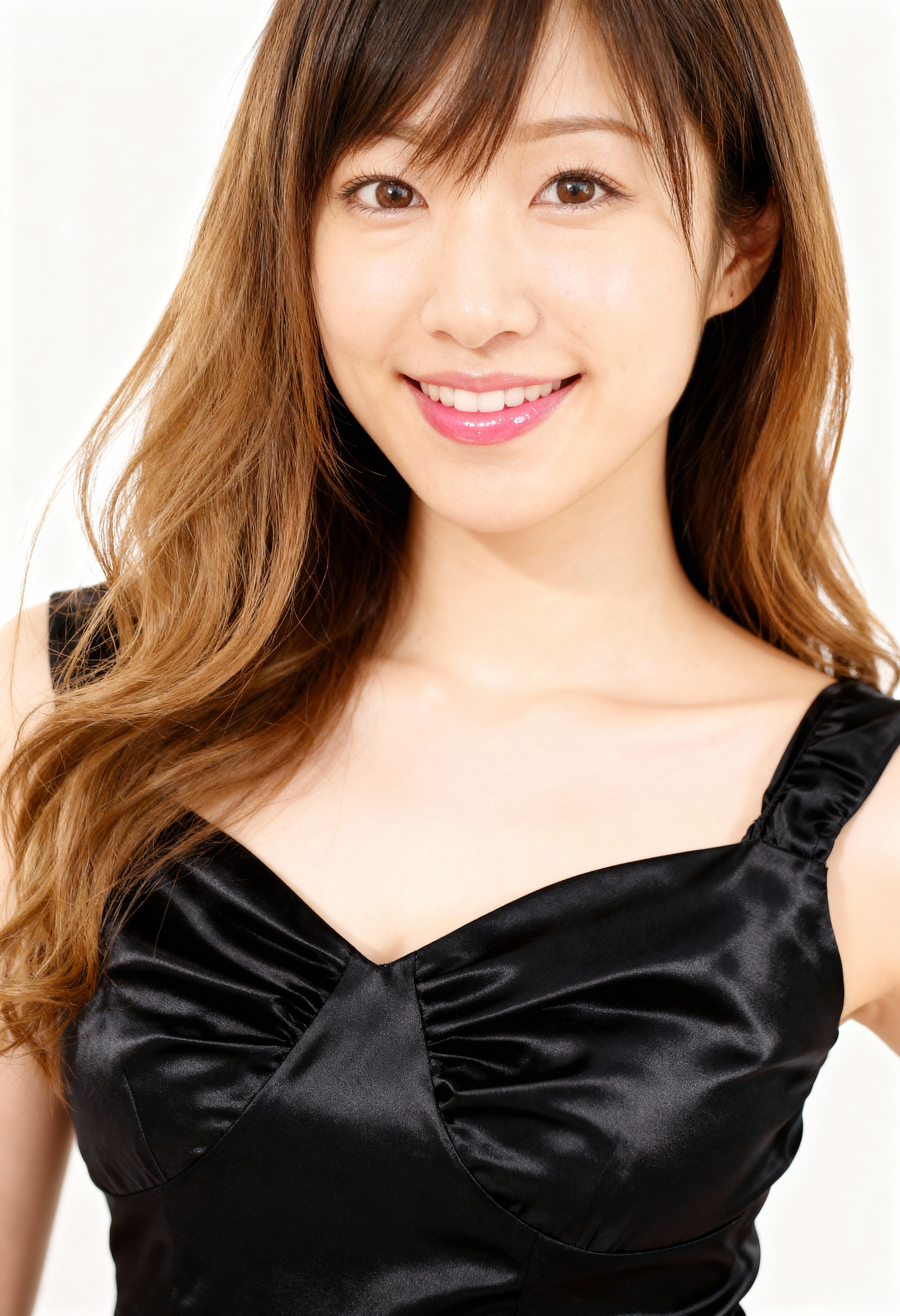 ウェーブのかかった茶色の長い髪と白い肌を持ち、カメラに向かって直接微笑む若いアジア人女性のポートレート。彼女は画像の中央に位置し、深いVネックラインと細いストラップが付いた黒いサテンのドレスを着ています。ドレスは肩にフィットし、彼女のほっそりとした体格と繊細な顔立ちを強調しています。彼女の茶色の目は見る人をまっすぐに見つめており、彼女の笑顔は温かく魅力的で、唇にはピンクの口紅がほんのりと塗られています。背景はシンプルな白で、ポートレートにクリーンで鮮明な背景を提供します。照明は柔らかく自然で、彼女の特徴を強調し、静けさの感覚を作り出しています。