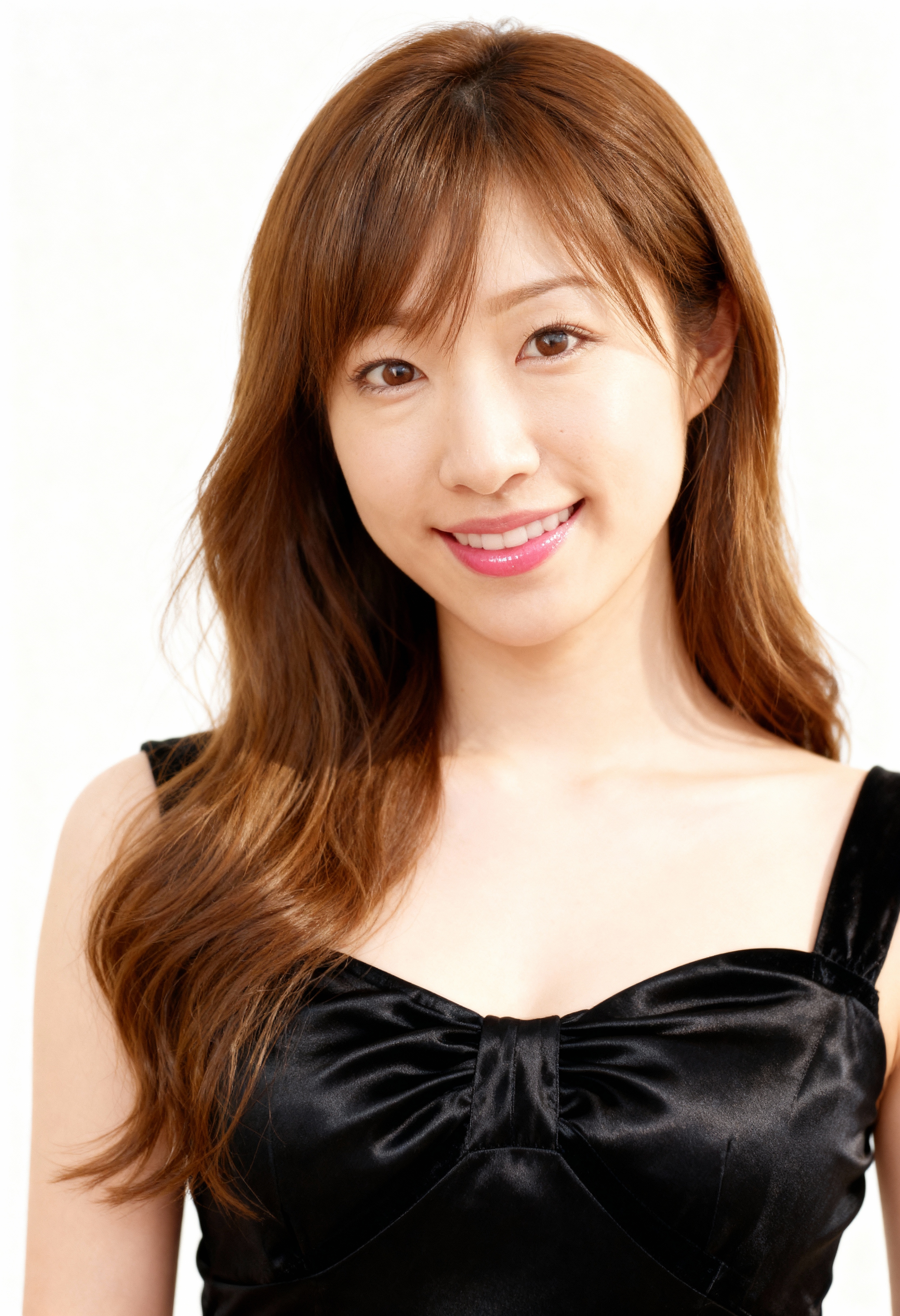 長くウェーブのかかった茶色の髪と白い肌を持ち、カメラに向かって微笑む若いアジア人女性のプロフェッショナルなポートレート。彼女は10代後半か20代前半のように見え、顔にわずかな笑みを浮かべ、茶色の目とほんのりピンクの口紅を見せています。彼女は、肩と鎖骨が露出した四角いネックラインの黒いサテンのドレスを着ています。彼女の髪はゆるやかなウェーブに整えられ、背中に流れ落ち、顔を完璧に縁取っています。背景は無地の白で、ポートレートにクリーンでミニマルな背景を提供します。照明は柔らかく自然で、彼女の特徴を強調し、肌に優しい輝きを生み出します。画像はプロが高解像度で撮影したものであるため、プロのポートレートに適しています。