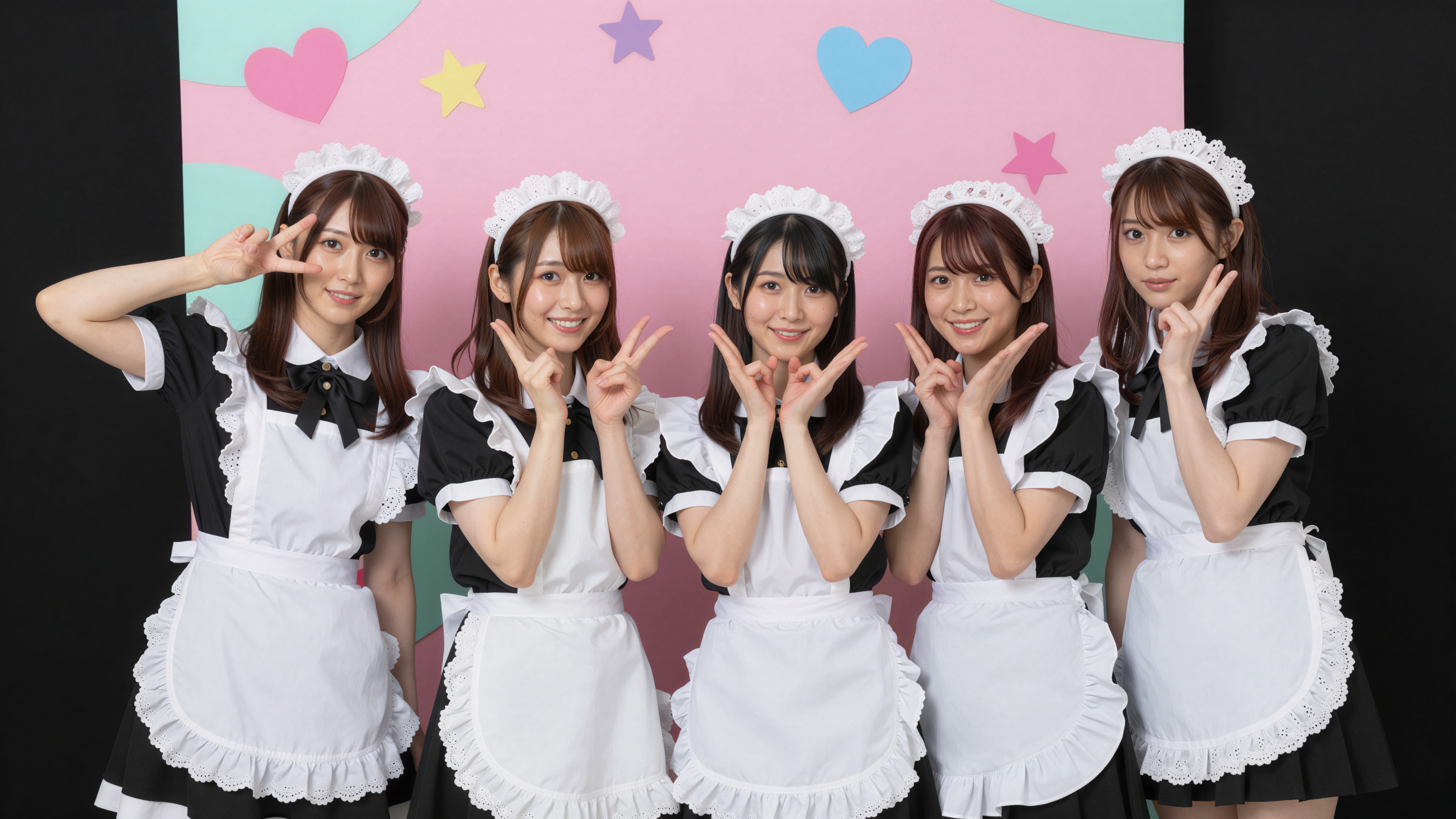 ピンクと青の心形や星が描かれた背景の前で、メイド服を着た5人の少女が並んでいます。全員がカメラに向かって微笑み、ピースサインやVサインをポーズをとっています。