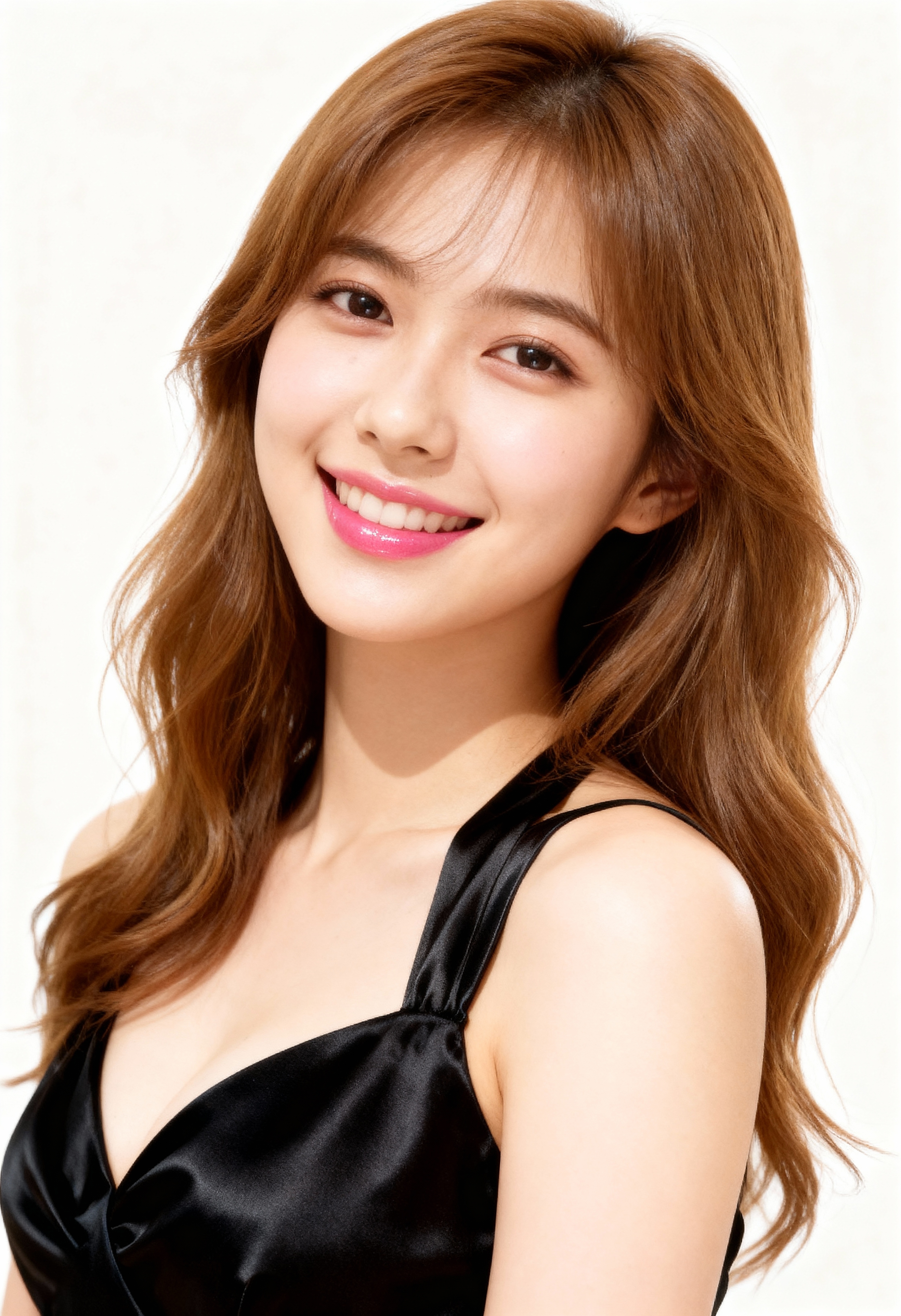 ウェーブのかかった長い茶色の髪をした若い女性がカメラに向かって微笑んでいる、ポートレート カメラ アングルからの写実的なポートレート撮影。彼女は画像の中央に位置し、鑑賞者に直接向き合い、優しい表情でまっすぐに見つめています。女性は10代後半か20代前半のように見え、肌は白く、顔にはかすかに笑みを浮かべている。彼女の茶色の髪はゆるやかなウェーブにスタイリングされ、背中に流れ落ち、顔を完璧に縁取っています。彼女は茶色の目をしており、裸の肩と肩を強調する深いVネックラインの黒いノースリーブのドレスを着ています。彼女の唇には明るいピンクの口紅が塗られており、単色の彼女の外観にポップな色を加えています。背景は無地の白で、写真にクリーンでミニマルな背景を提供します。照明は柔らかく自然で、彼女の特徴を強調し、暖かく魅力的な雰囲気を作り出しています。全体的な印象は、穏やかな美しさと自信です。