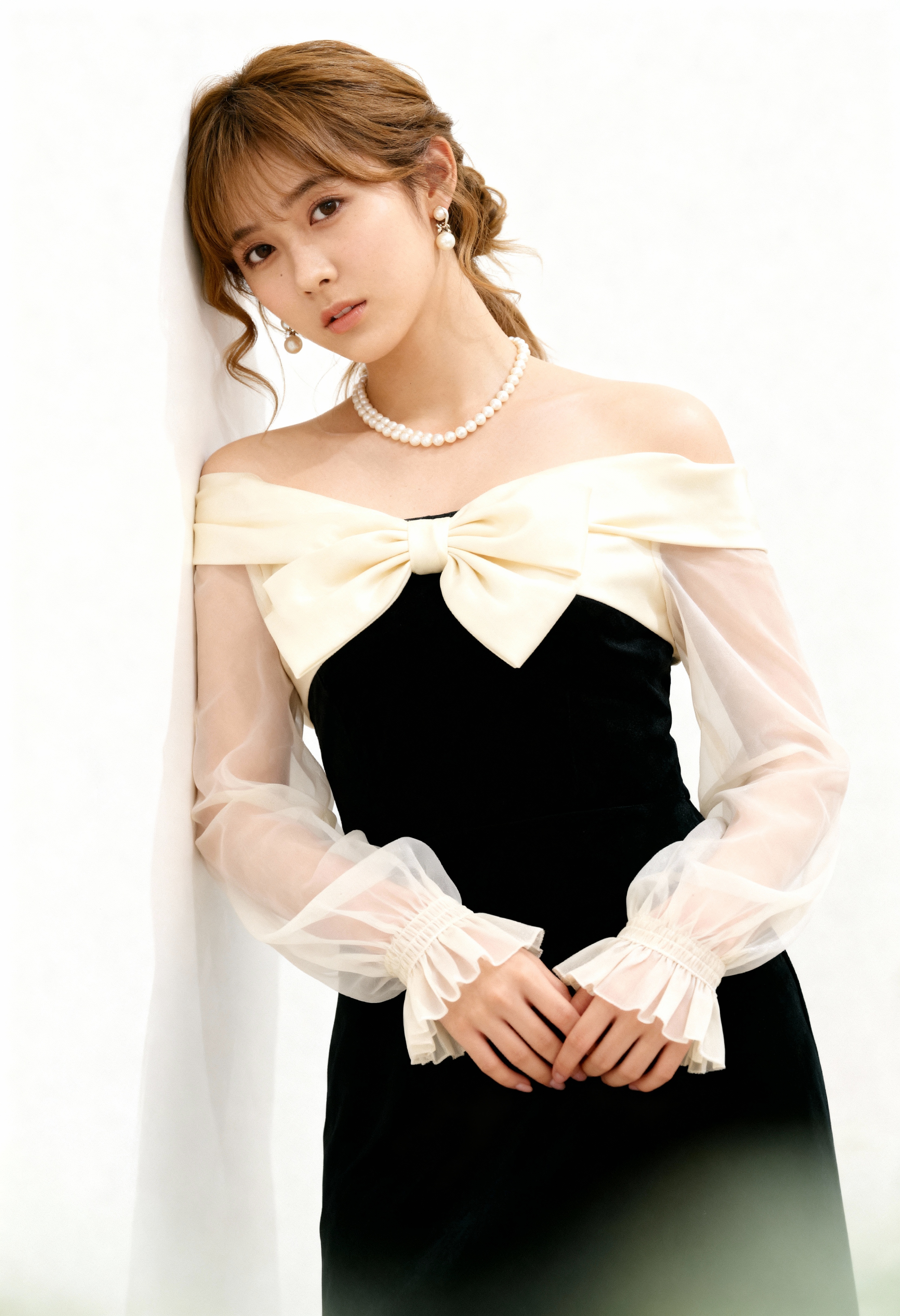 薄手の袖と大きなリボンが付いたフォーマルな衣装を着た若い女性が、無地の白い壁に向かってポーズをとる、ポートレート カメラ アングルからの写実的な撮影。画像には、ネックラインに大きな白いリボンと薄手の袖が付いた白いオフショルダーのトップスを着た黒いベルベットのドレスを着て、画像の中央に立っている女性も写っています。彼女はゆるいカールでスタイリングされたウェーブのかかった茶色の長い髪を持ち、真珠のイヤリングと真珠のネックレスを身に着けています。女性は中立的な表情でカメラを直接見つめており、目は茶色で、唇はわずかに開いています。彼女の手は彼女の前で組まれています。背景は無地の白で、画像にクリーンでミニマルな背景を提供します。