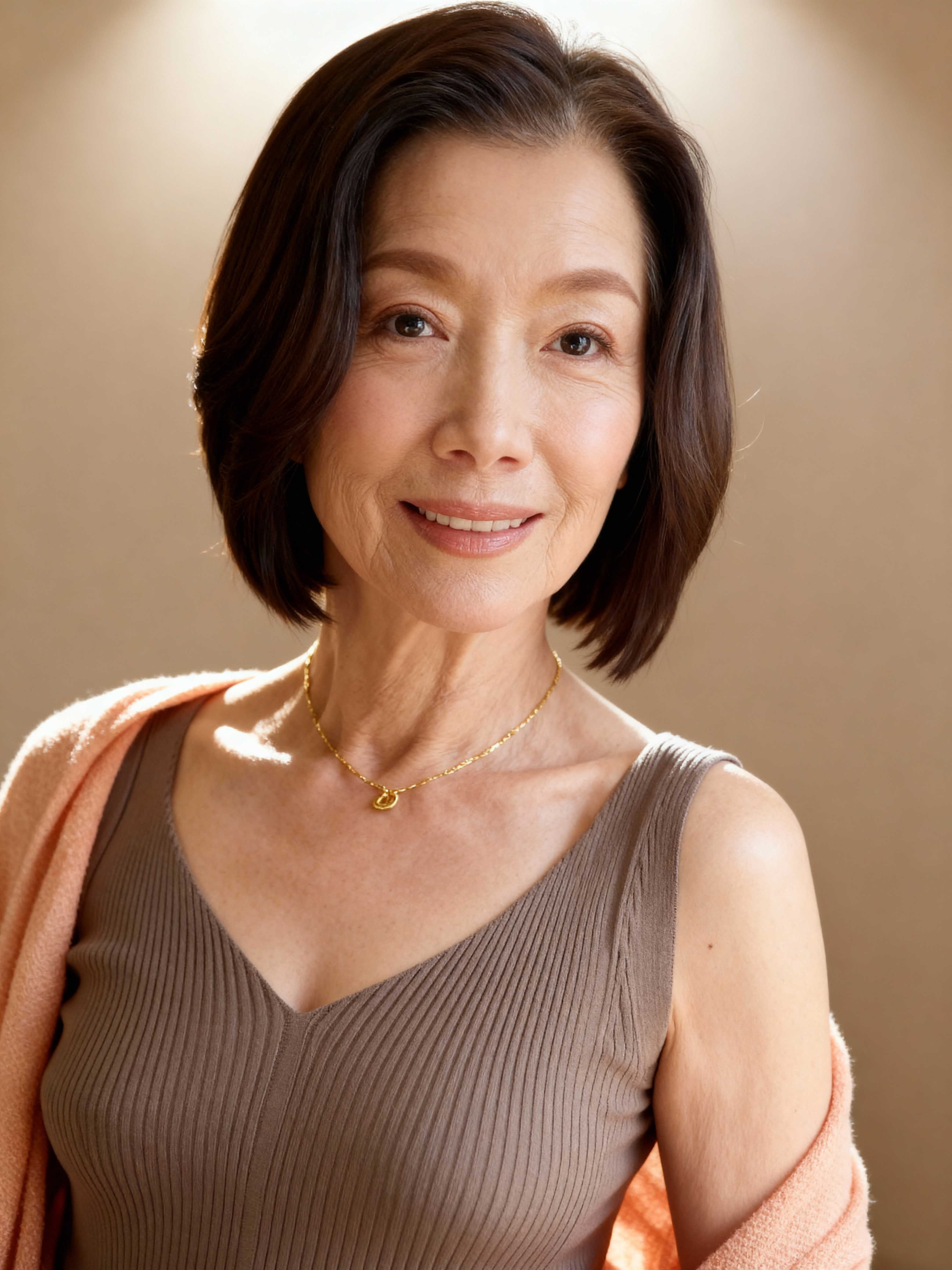 カメラに向かって微笑む、短い黒髪の中年のアジア人女性のポートレート。彼女は60代後半か70代前半に見え、薄茶色のリブタンクトップと薄ピンクのカーディガンを肩にかけています。女性はフレームの中央に立っていて、小さなハートのペンダントが付いた金のネックレスをしています。彼女の髪はショートボブカットで、視聴者をまっすぐに見つめる茶色の目をしています。彼女の表情はフレンドリーで魅力的で、唇をわずかに開き、顔にわずかな笑みを浮かべています。背景は柔らかくぼやけたベージュ色で、彼女の服装の暖かい色調に微妙なコントラストを与えています。照明は柔らかく自然で、暖かく居心地の良い雰囲気を作り出しています。画像全体の雰囲気はリラックスしていて自信があり、暖かさと快適さの感覚を伝えます。