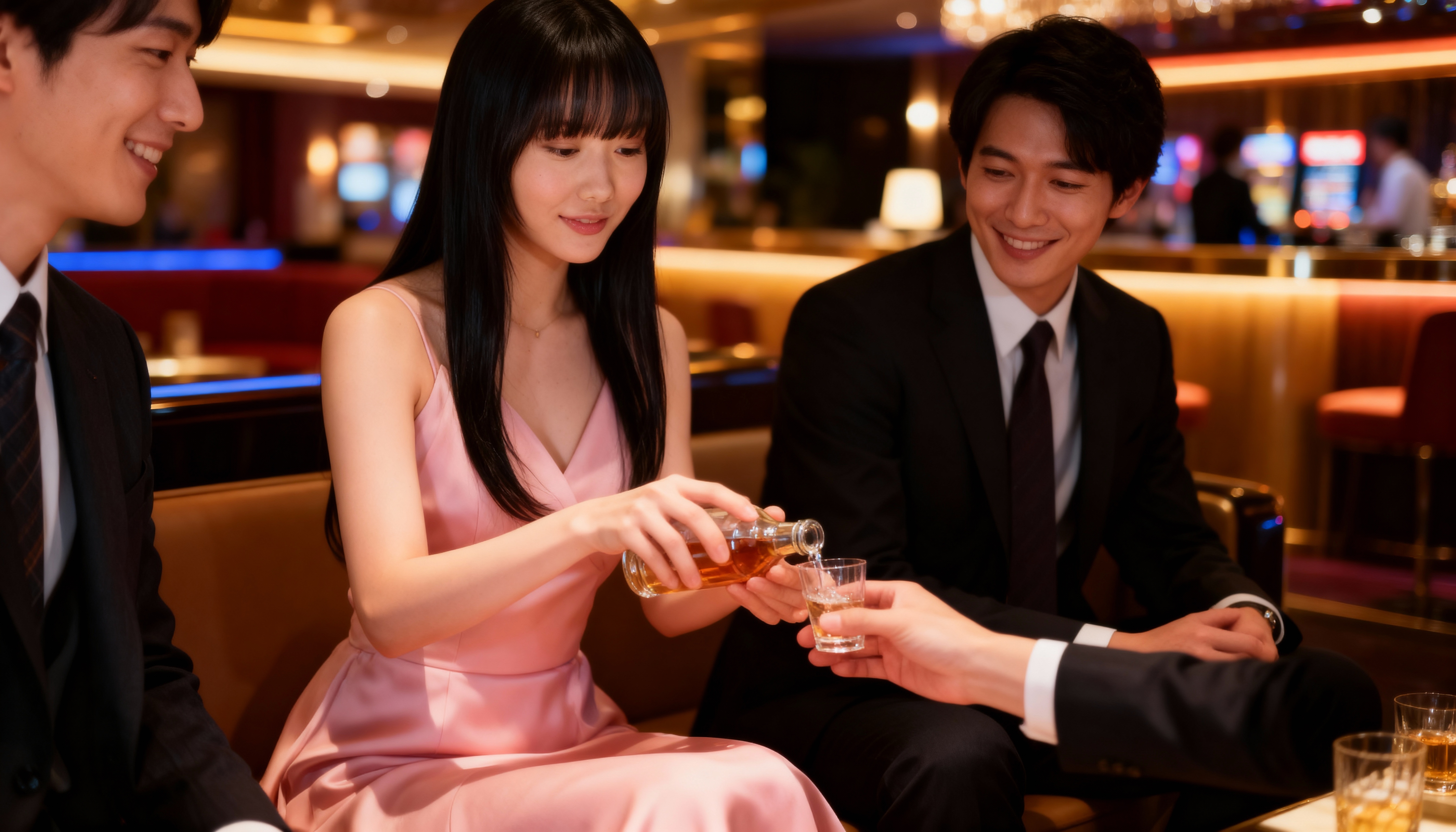 薄暗いバーの雰囲気の中でドリンクを楽しむ、フォーマルな服装をしたアジア系の若い男性 3 人を正面から写実的に撮影したもの。画像には、ピンクのサテンのドレスを着た女性が、画像の中央でボトルからグラスに飲み物を注いでおり、その両側に座っている2人の男性も写っている。その女性は長い黒髪とほっそりとした体格の若い成人のように見え、深いVネックと細いストラップが付いたピンクのドレスを着て、前景のソファに座っています。彼女は右手にボトルを持ち、左手にある小さなグラスに飲み物を注いでいる。一方、短い黒髪の若い成人と思われる男性たちは、黒いスーツに白いシャツとネクタイを着て後ろに座っている。彼らは皆笑顔でお互いを見つめており、そのうちの1人は右手にウィスキーのグラスを持っています。背景はぼやけていますが、ぼやけたスロット マシンと照明を備えたバーが見え、居心地の良い雰囲気を作り出しています。照明は柔らかく温かみがあり、3 人の男性の間の親密な瞬間を強調しています。