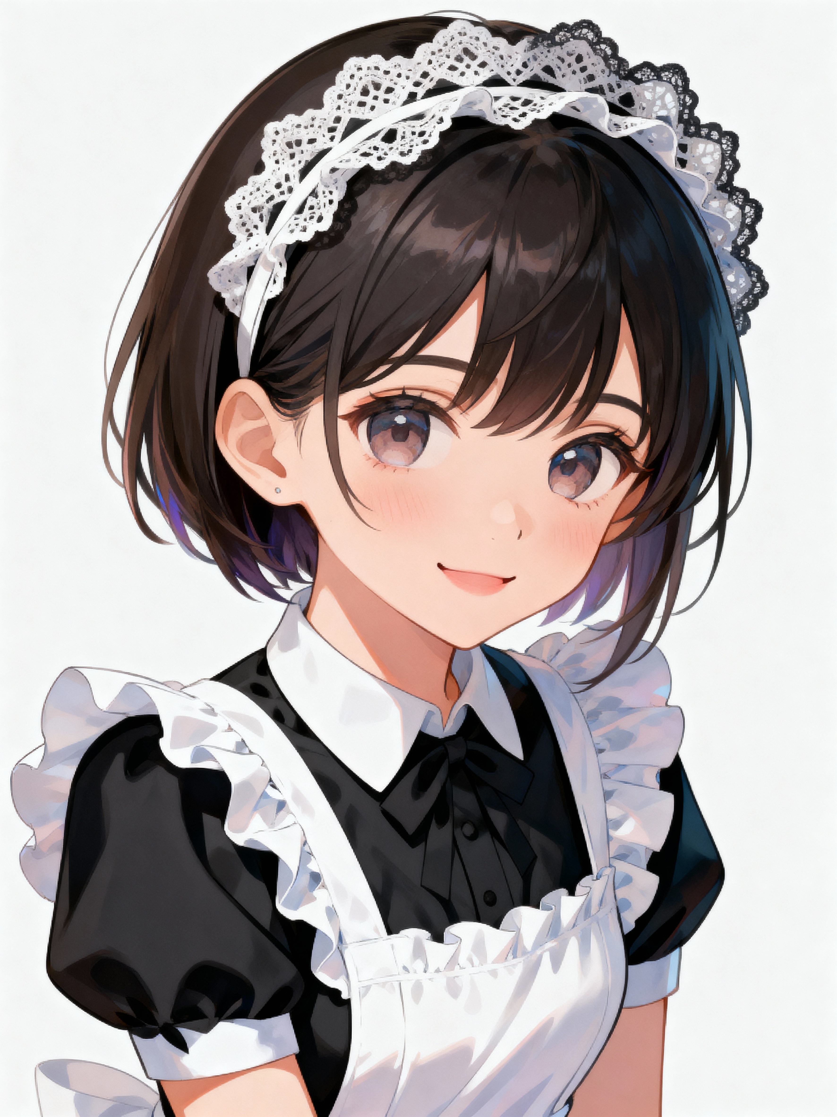白いエプロンと白いレースのカチューシャを付けた白黒のメイド服を着た、短い黒髪と紫のハイライトを持つ若いメイドのアニメ風のかわいいイラストです。メイドの女の子1人は画面中央に位置し、上半身を視聴者に向け、優しい笑顔で視聴者をまっすぐに見つめています。彼女の目は大きくて表情豊かで、ほおは少し赤くなっています。髪は前髪が顔を縁取るショートボブカットで、顔にはうっすらと笑みを浮かべている。彼女は袖にフリルが付いた白いメイドエプロンとその下に黒いシャツを着ており、メイド服を引き立てています。背景は無地の白で、メイドの衣装に清潔感と鮮明なコントラストを与えます。