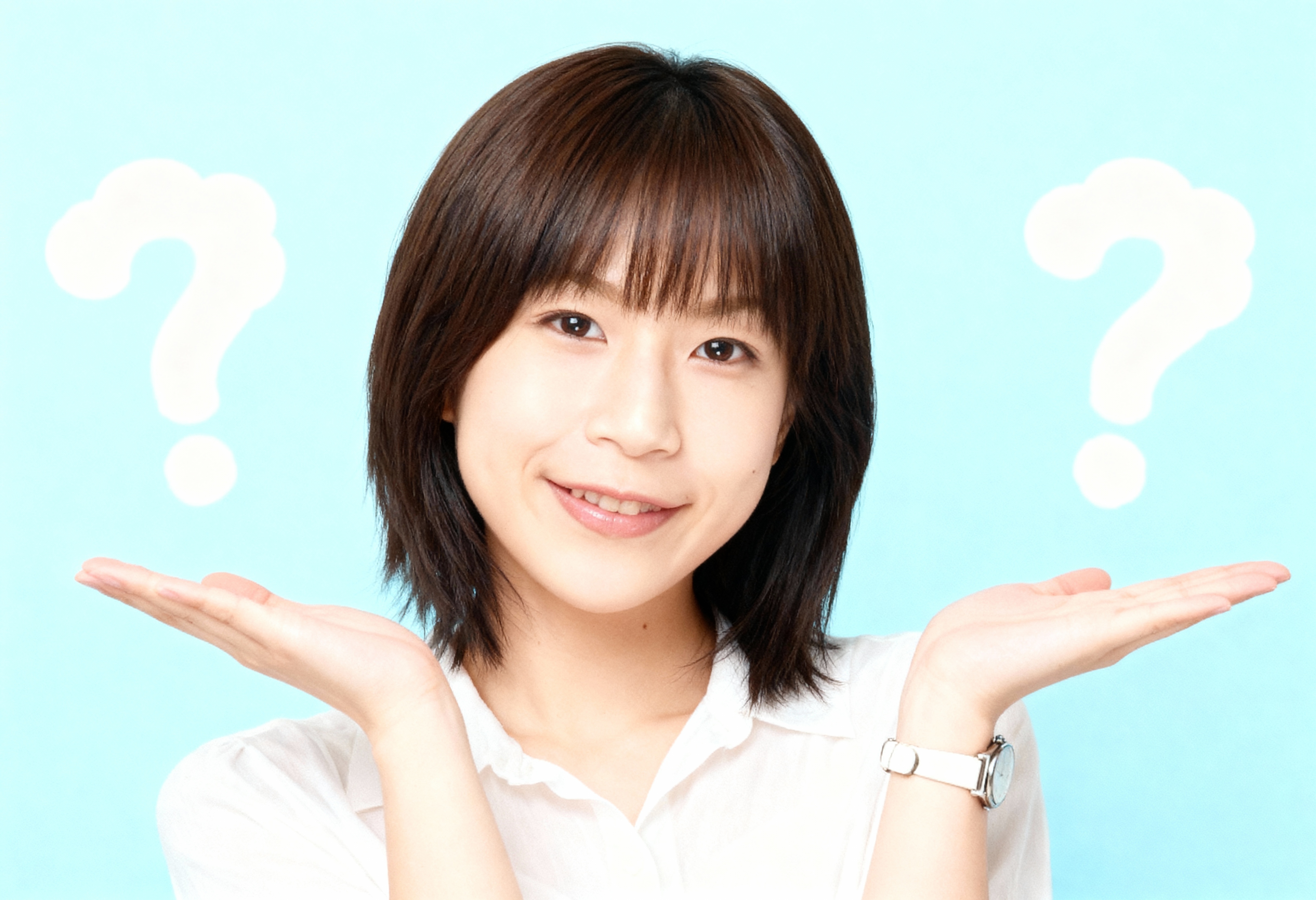 短くストレートなダークブラウンのボブヘアカットと白い肌を持ち、カメラに向かって微笑む若いアジア人女性の写実的なポートレート。彼女は画像の中央に位置し、白いブラウスを着て、左手首に銀の時計をしています。彼女の両手は顔の前で組まれており、白い雲と水色の背景に疑問符が頭の上に浮かんでいます。女性は10代後半か20代前半のように見え、口元にはわずかな笑みを浮かべ、頬には少しシワがあった。彼女の目は視聴者をまっすぐに見つめており、前髪が顔を縁取るボブカットに整えられた茶色の髪をしています。