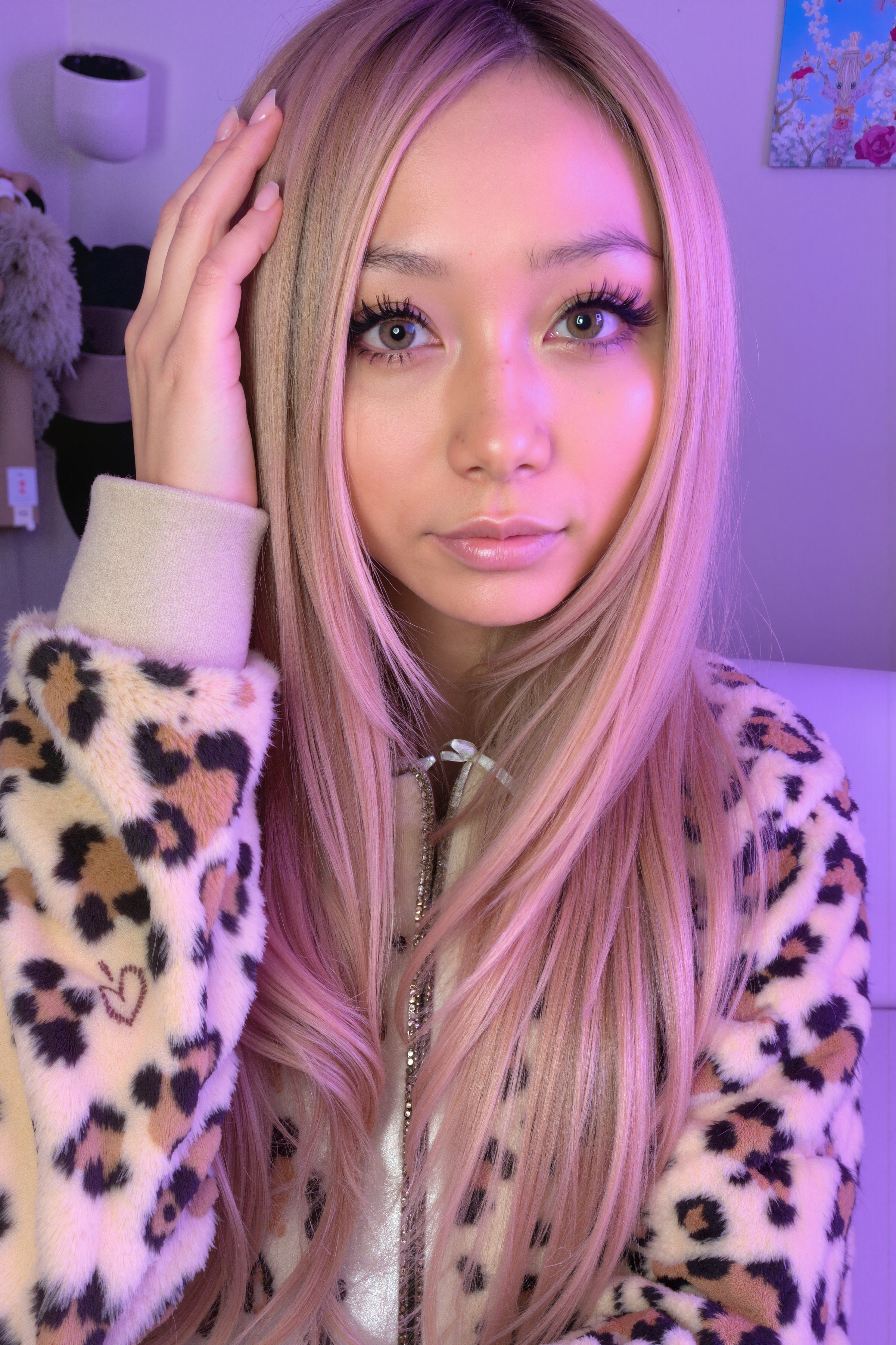 ウェーブのかかった長いブロンドの髪と、大きく表情豊かな茶色の瞳を持ち、ヒョウ柄のジャケットを着た若い女性を、クローズアップ カメラ アングルから写実的に撮影した写真。この画像には、背景に桜の木の絵が描かれた、柔らかなライラック色の壁も示されています。画像の中央では、19歳の女性が無表情でカメラをまっすぐに見つめているように見えます。彼女は顔にわずかな笑みを浮かべ、片手で髪を押さえています。彼女の髪はピンクのハイライトが入ったロングヘアにスタイリングされており、目は大きくて表情豊かです。彼女はヒョウの斑点のあるベージュのジャケットを着ており、その下に白いトップスを着ています。背景は、白いソファと棚にいくつかのアイテムがあるミニマルな部屋です。照明は柔らかく温かみがあり、居心地の良い雰囲気を作り出しています。