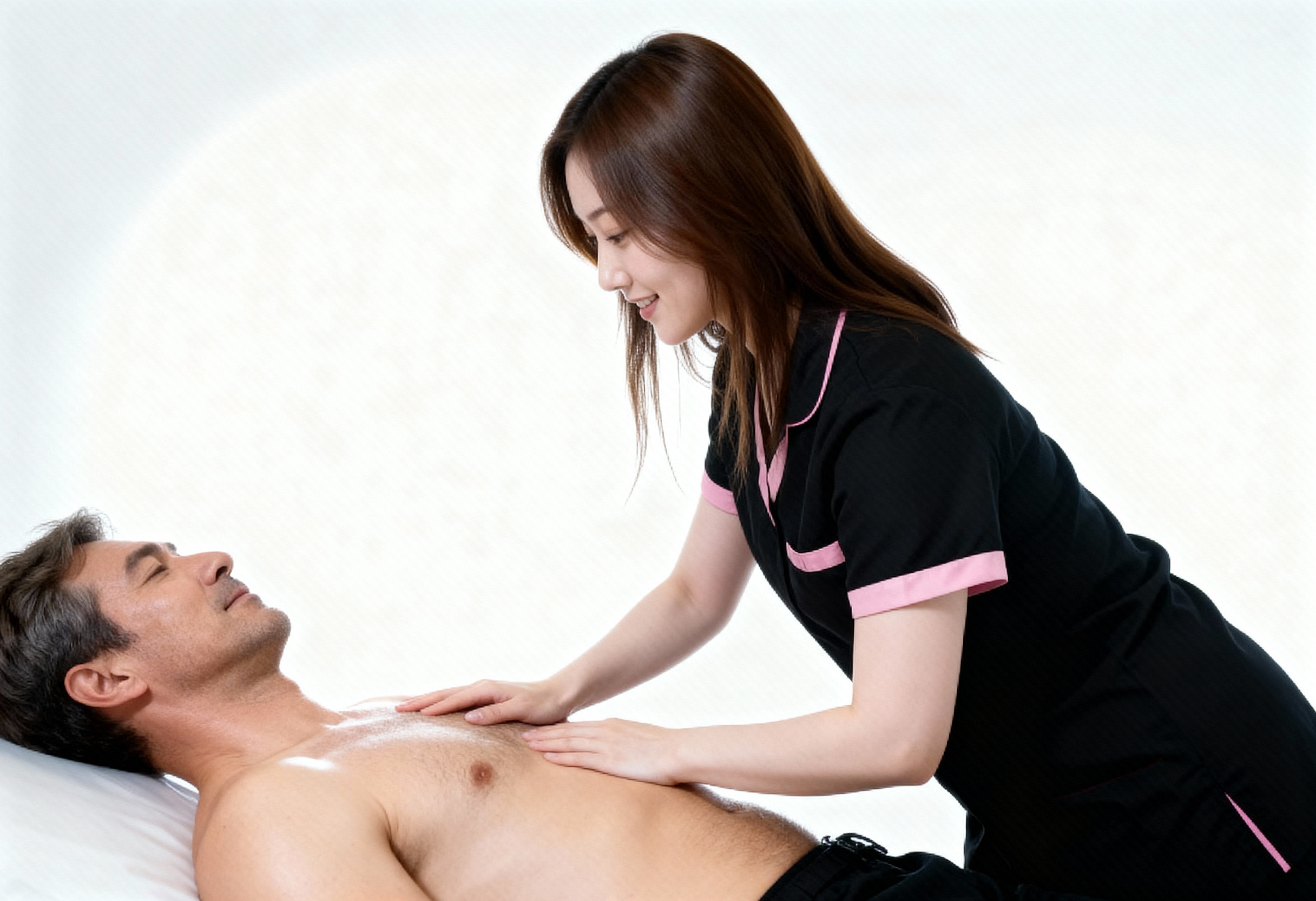 親密な環境で男性と交流する女性を横から見たフォトリアルな撮影。画像には、画像中央の白い面に横たわり、目を閉じてリラックスした表情を浮かべている男性も写っています。その男は、短い茶色の髪とスリムな体を持つ中年のアジア人男性のように見えます。彼は上半身裸で、胸に小さな陰毛が生えています。ピンクの縁取りがついた黒い制服を着た女性が彼の後ろに立って、両手で彼の胸を優しくマッサージしている。彼女は背中に落ちる長い茶色の髪を持っており、顔に微笑みを浮かべて彼を見上げています。彼女は目を閉じ、口をわずかに開いており、まるでその瞬間を楽しんでいるかのようです。背景はシンプルな白のグラデーションで、画像にクリーンでミニマルな外観を与えます。