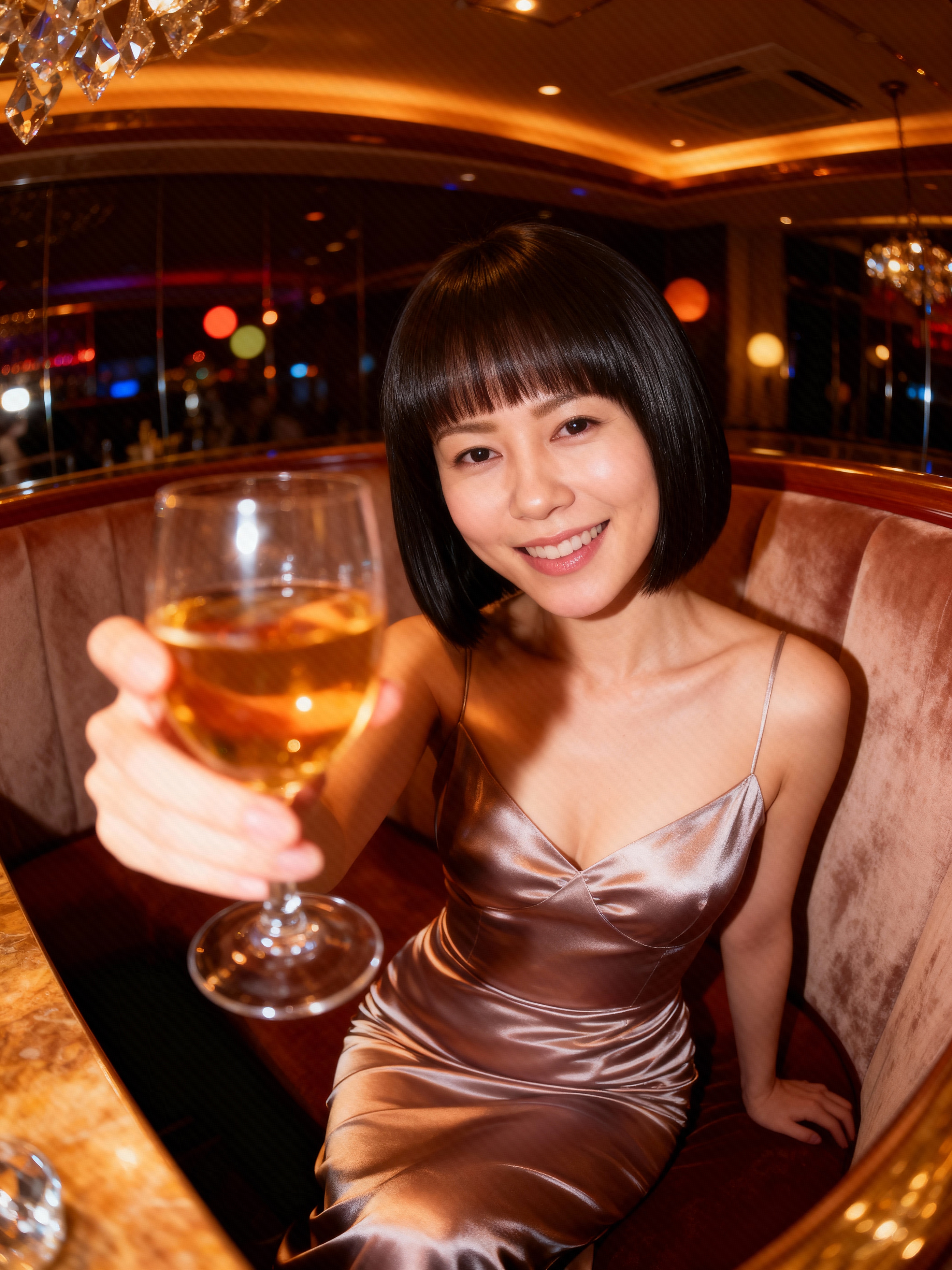 絹のような茶色のスリップ ドレスを着て、コニャックのグラスを持ち、バーに座っている若い女性を正面から写実的に撮影したもの。この画像には、ぼやけた光とシャンデリアが背景にある薄暗いバーのインテリアも示されています。画像の中央には、短い黒髪、前髪、笑顔の 20 歳のアジア人女性が、高級レストランのベルベットのブースに座っています。彼女は、スリムなボディとむき出しの肩を強調する、光沢のあるブラウンのサテンのスリップドレスを着ています。女性は右手にワイングラスを持ち、左手はバーカウンターの上に置いています。照明は暖かく柔らかで、居心地の良い雰囲気を作り出しています。