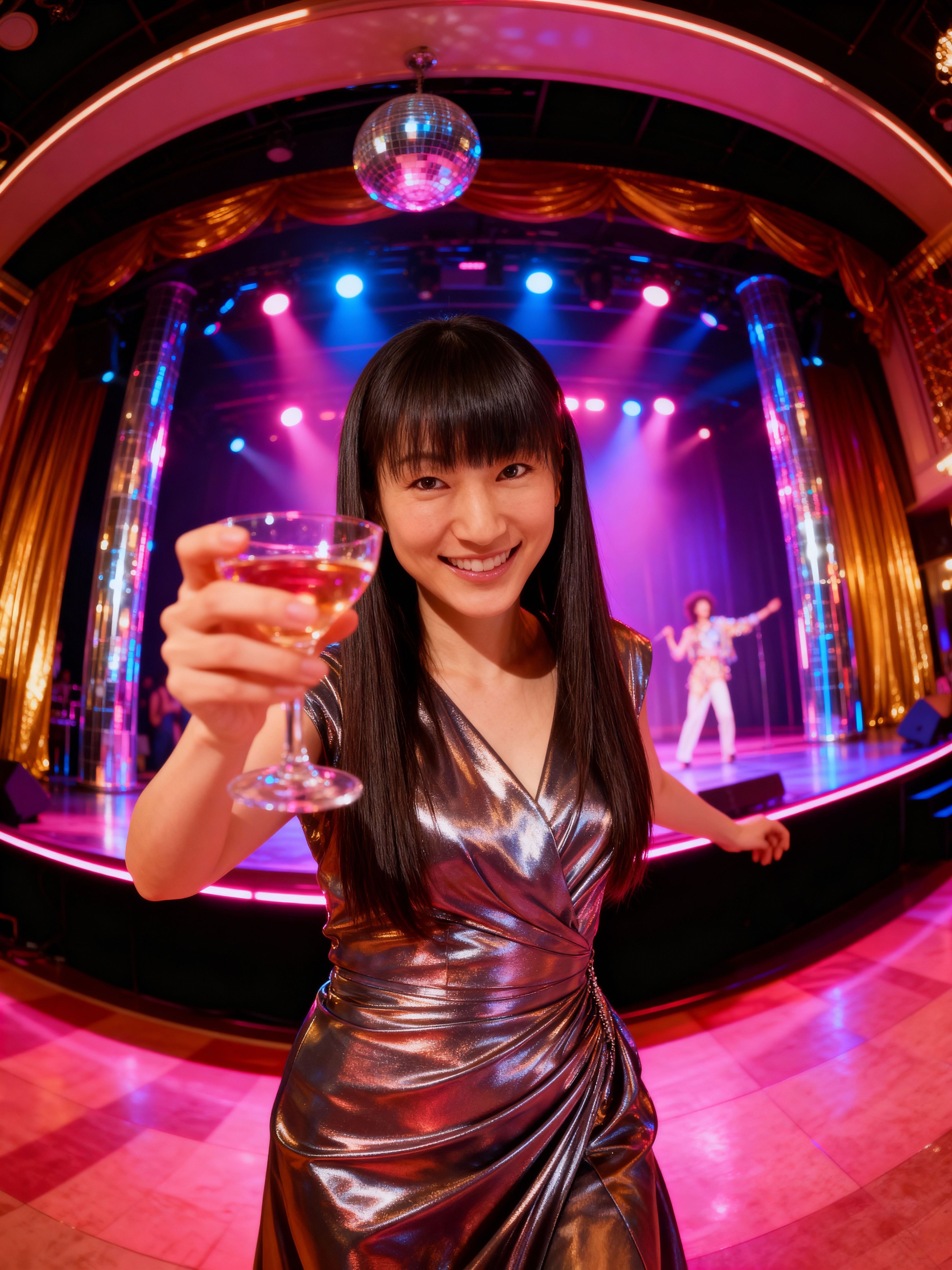 薄暗いナイトクラブの環境でワインのグラスを持った若い女性を正面カメラのアングルから写実的に撮影したもの。この画像には、天井からぶら下がっているミラーボールとステージを照らす色とりどりのライトも示されています。画像の中央には、長い黒髪と前髪を持ち、光沢のある銀のドレスを着た若いアジア人女性が、右手にワイングラスを持ち、顔に笑みを浮かべて立っています。彼女は10代後半から20代前半に見え、スリムな体と人懐っこい表情をしています。彼女の目はカメラをまっすぐに見つめており、口はわずかに開いていて、歯が見えています。彼女の髪は、前髪が顔を縁取るストレートでストレートな外観にスタイリングされています。彼女は体型を強調するシルバーのドレスを着ており、フレームの中央に立っています。背景にはカラフルなライトが輝くステージとディスコダンサーが描かれており、ナイトクラブの活気に満ちた雰囲気を高めています。