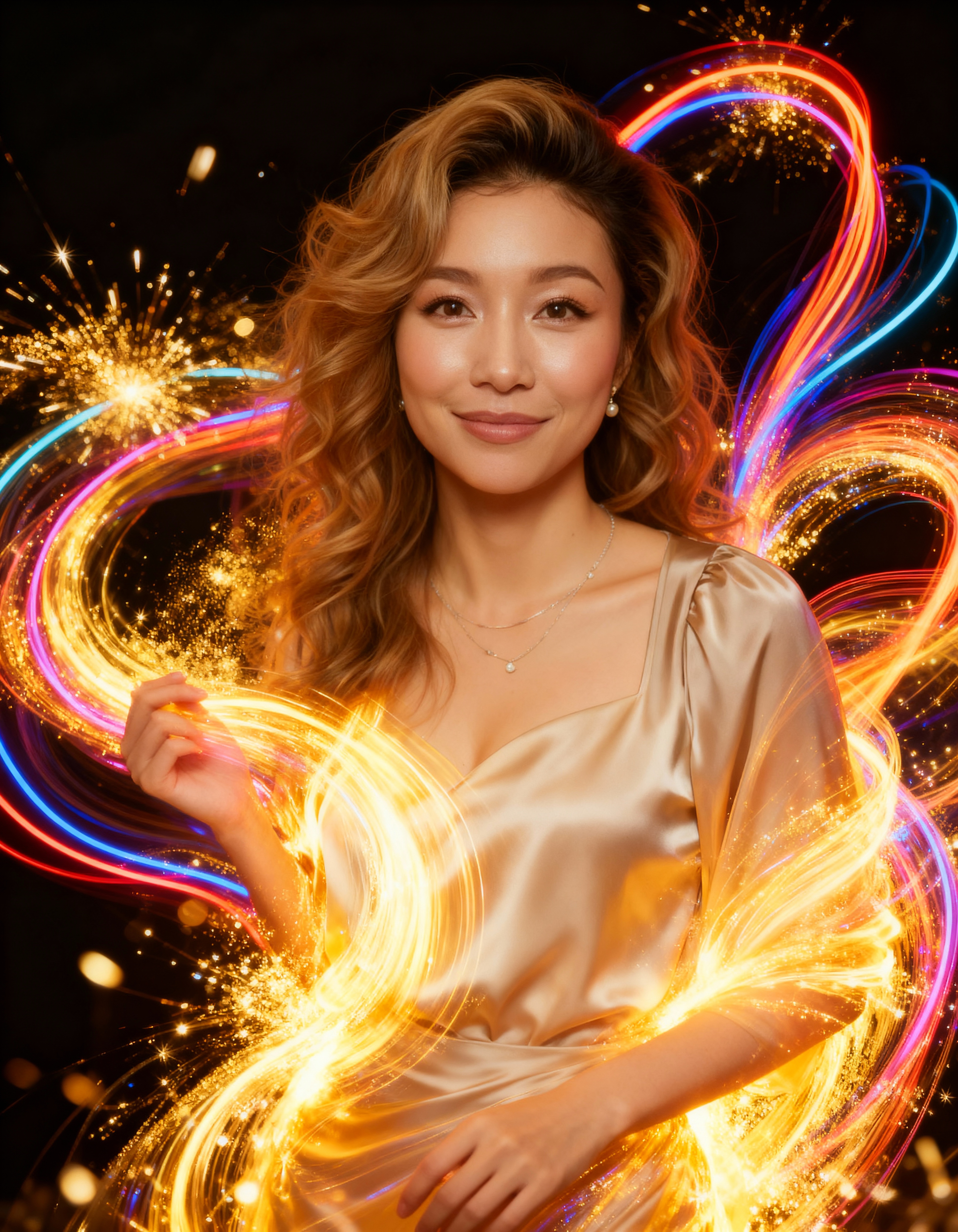 ウェーブのかかった茶色の長い髪を持ち、彼女の姿を強調する絹のような金色のドレスを着た女性のポートレート。彼女は画像の中央に立って上半身が見え、右手に光る球を持っています。女性は温かく魅力的な笑顔を浮かべており、茶色の目は視聴者をまっすぐに見つめています。彼女の髪はゆるいウェーブにスタイリングされ、繊細なネックレスを身に着けています。背景は暗い星空で、彼女の顔から放射状にカラフルに輝く線が魅惑的な効果を生み出しています。照明は柔らかく温かみがあり、女性の特徴と周囲の輝く粒子を強調しています。