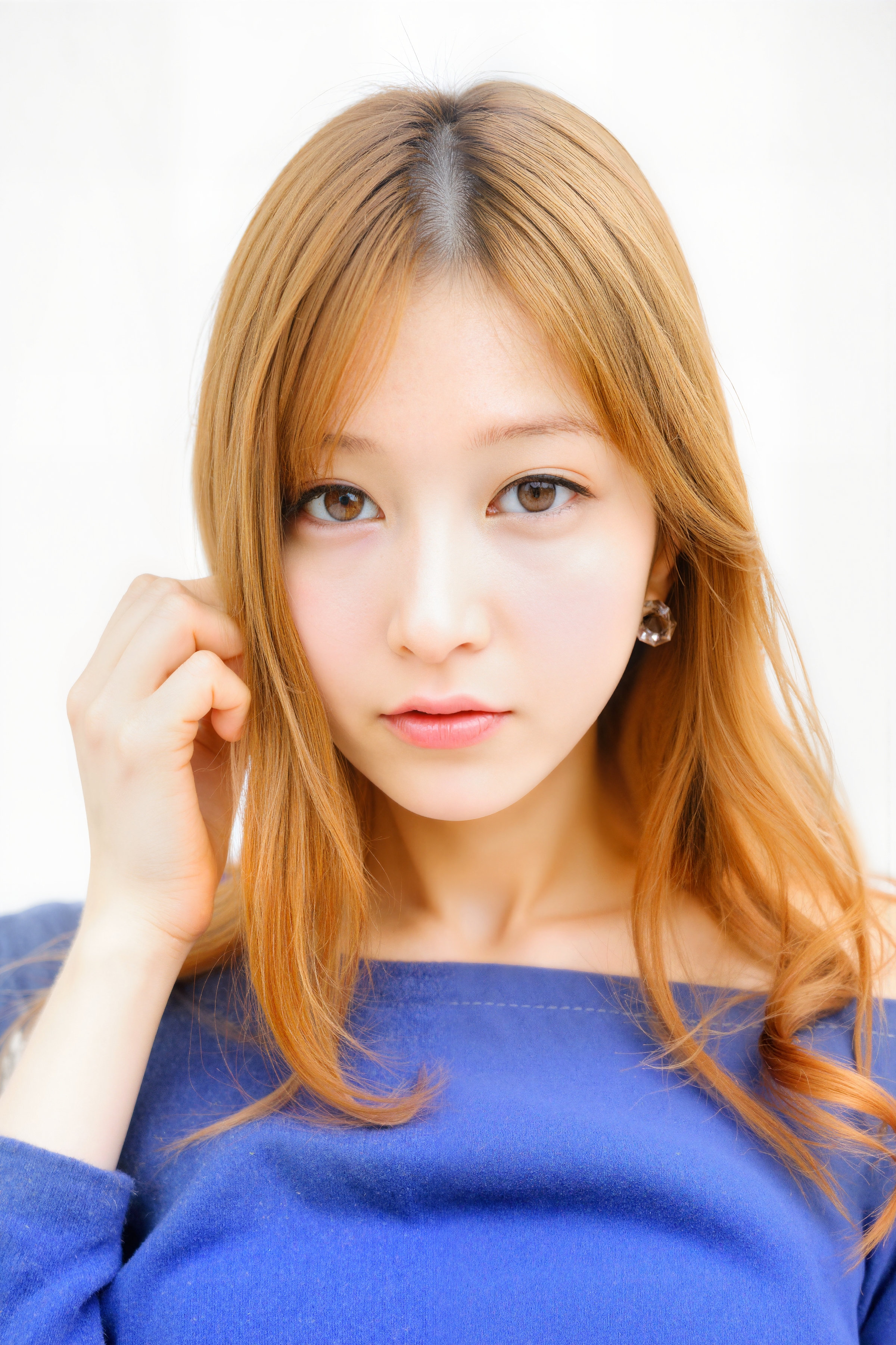 ウェーブのかかった明るい茶色の長い髪と茶色の目をした、青いオフショルダー セーターを着た若い女性をポートレート アングルから撮影した写実的なポートレート。この画像には、白い背景に柔らかくぼやけた背景も示されています。画像の中央では、20歳のアジア人女性が左頬に手を当て、中立的な表情で視聴者をまっすぐに見つめているように見えます。彼女は白い肌、小さな鼻、そして口元にわずかな笑みを浮かべています。彼女の髪はゆるやかなウェーブで背中に流れており、数本の髪が顔を縁取っています。彼女の目は大きくて茶色で、スタッドのイヤリングをしています。彼女の服装は、青い長袖セーターで、少し大きめでリラックスしたカジュアルな雰囲気があります。照明は柔らかく自然で、彼女の特徴を強調し、肌に優しい輝きを生み出します。全体的な効果は、若い女性の顔と上半身の美しさを捉えた、美しく穏やかなイメージです。