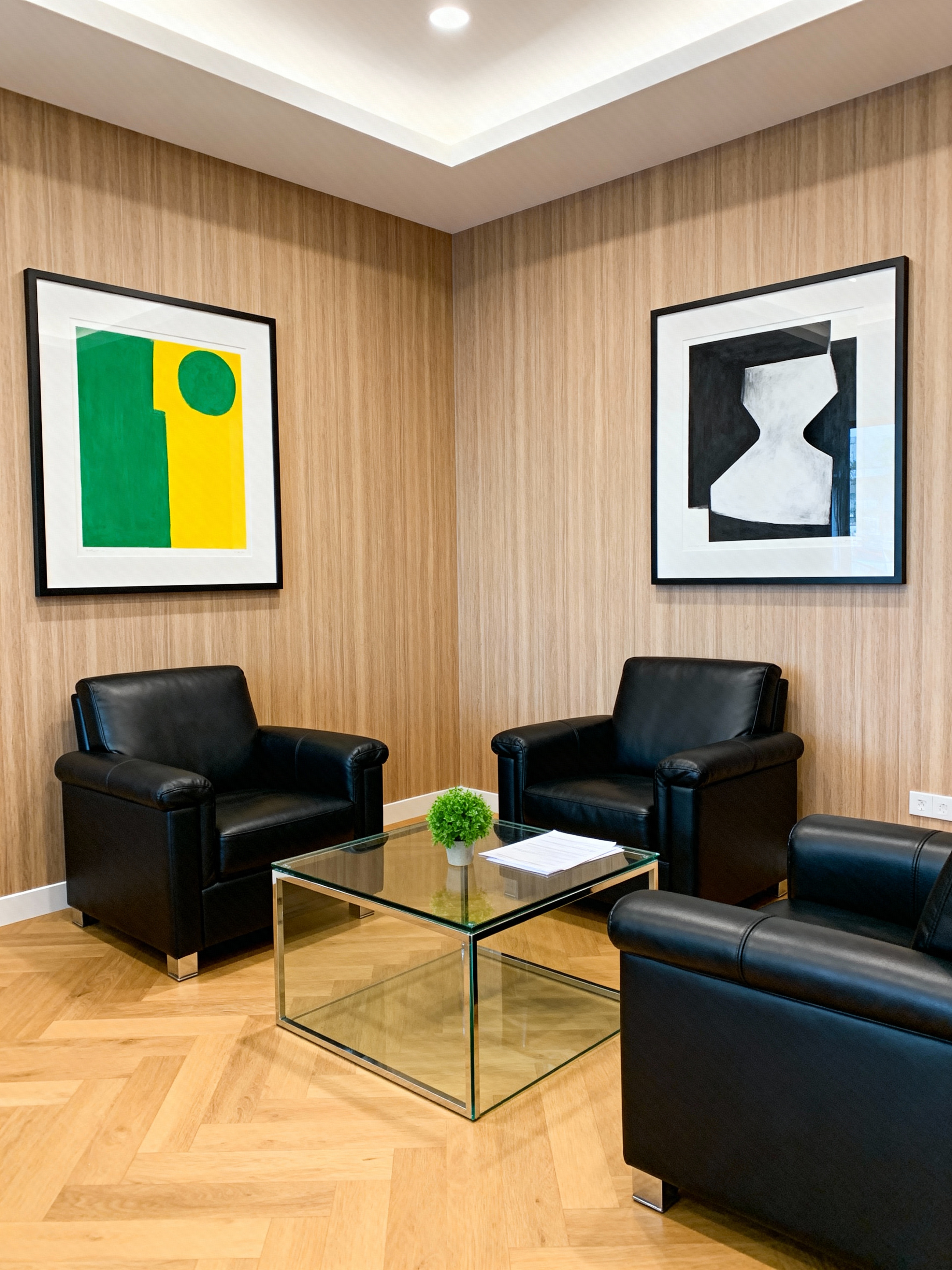 部屋の中央に 2 つの黒い革張りの椅子とガラスのコーヒー テーブルを備えたモダンなオフィスの待合室。壁は木製パネルで作られており、温かみのある雰囲気を醸し出しています。画像の左側には、2 つの額入りの抽象芸術作品が壁に掛けられています。1 つは明るい黄色と緑の配色の大きな抽象絵画で、もう 1 つはミニマルな白と黒の抽象絵画です。客室はすっきりとしたラインとミニマルな家具を備えた現代的なデザインです。右側のガラステーブルには小さな鉢植えが置かれ、単色の空間に緑を添えています。部屋は埋め込み型の照明で明るく、明るく風通しの良い雰囲気を作り出しています。床は明るい色の木の板で作られており、壁や家具のニュートラルな色調と見事にコントラストを成しています。