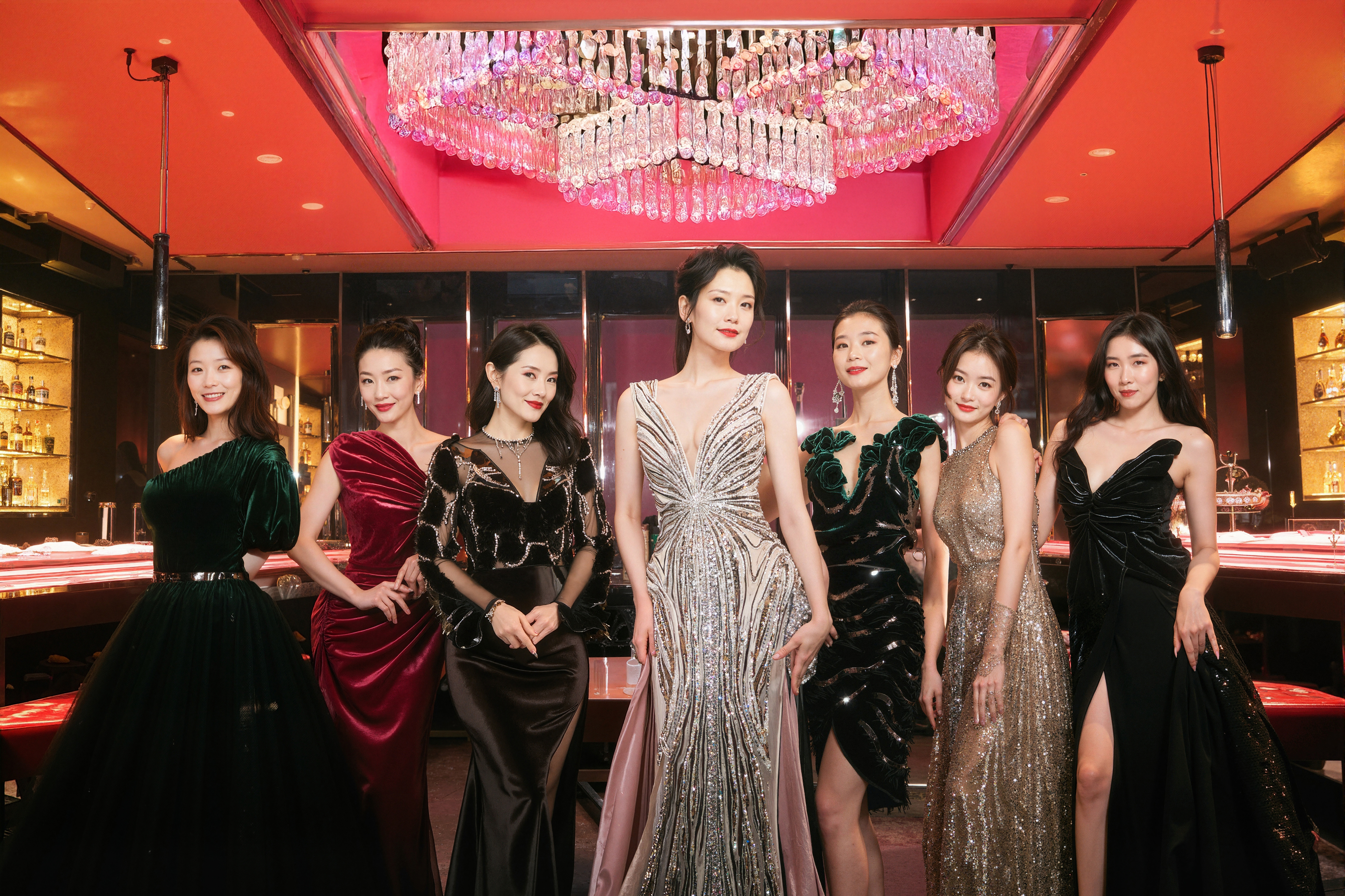 高級宝石店に立ち、大きなピンクのシャンデリアの前で写真を撮る 7 人の女性のグループ。女性たちは、黒、赤、金、銀、黒など、さまざまな色のエレガントなイブニングガウンを着ています。彼らは皆笑顔でカメラをまっすぐに見つめており、洗練さと魅力の感覚を生み出しています。グループの中央には、短い黒髪で真剣な表情の女性が立っており、深く開いたネックラインと太ももまでのスリットが入った銀色のスパンコールのガウンを着ています。彼女の左側には、長い黒髪の別の女性がドレープネックラインの黒いベルベットのドレスを着ており、右側には、金のスパンコールが付いた黒いドレスを着た3人目の女性が腰に手を当てて立っており、4人目の黒髪の女性が彼女の後ろに立っている。 7人の女性は全員、髪をエレガントなアップヘアに整え、顔には赤い口紅を塗って華やかな雰囲気を醸し出している。