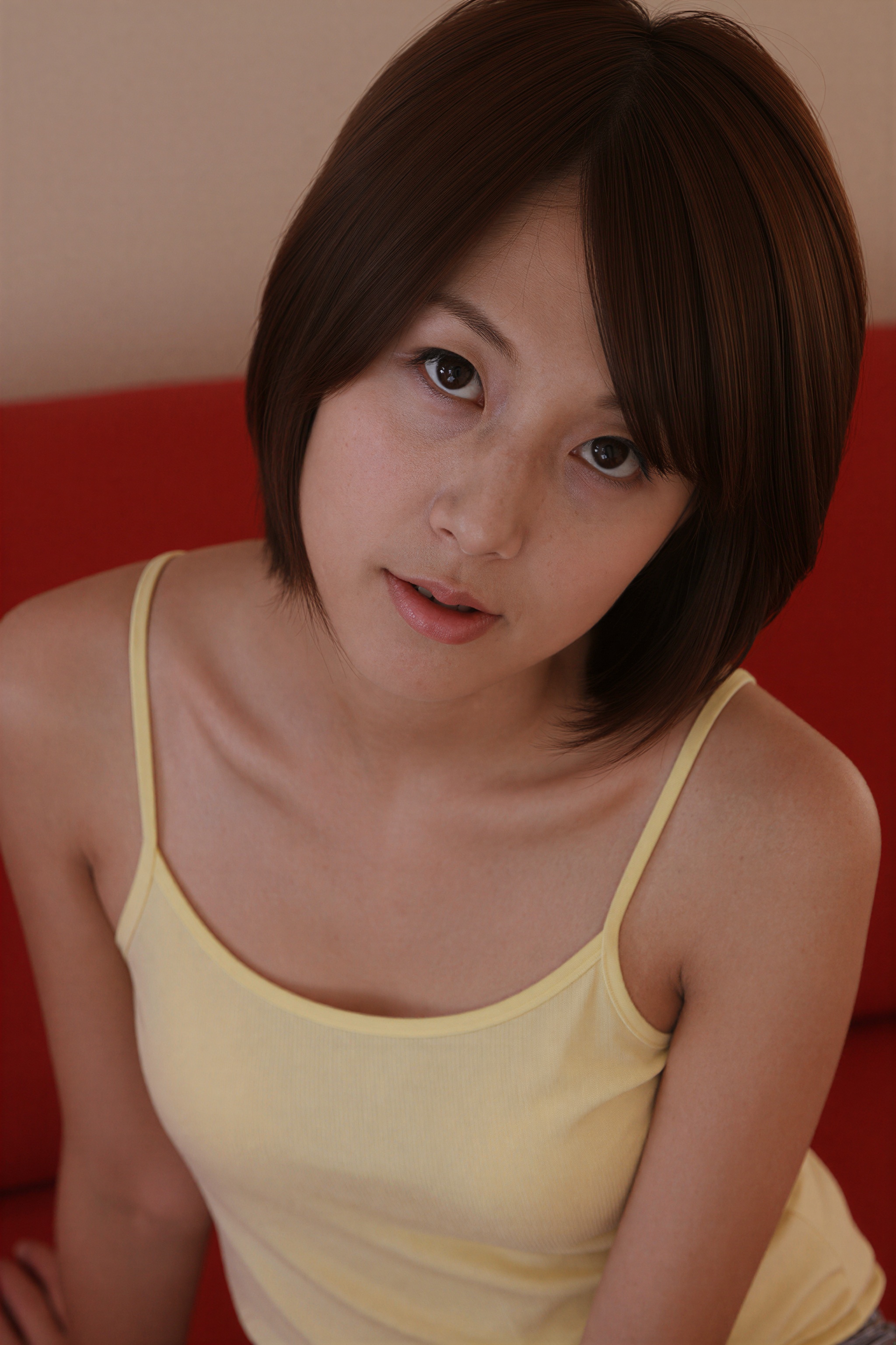 赤いソファに座り、中立的な表情でカメラを直接見つめている若い女性。彼女は10代後半か20代前半に見え、色白で、茶色の髪をショートボブカットにしています。彼女の目は印象的な茶色の色合いで、唇にはわずかに笑いを浮かべています。彼女は細いストラップが付いた薄黄色のキャミソールを着ており、裸の肩が見えています。。高画質でフリーのNightStock素材です。商用利用可能・クレジット表記不要。