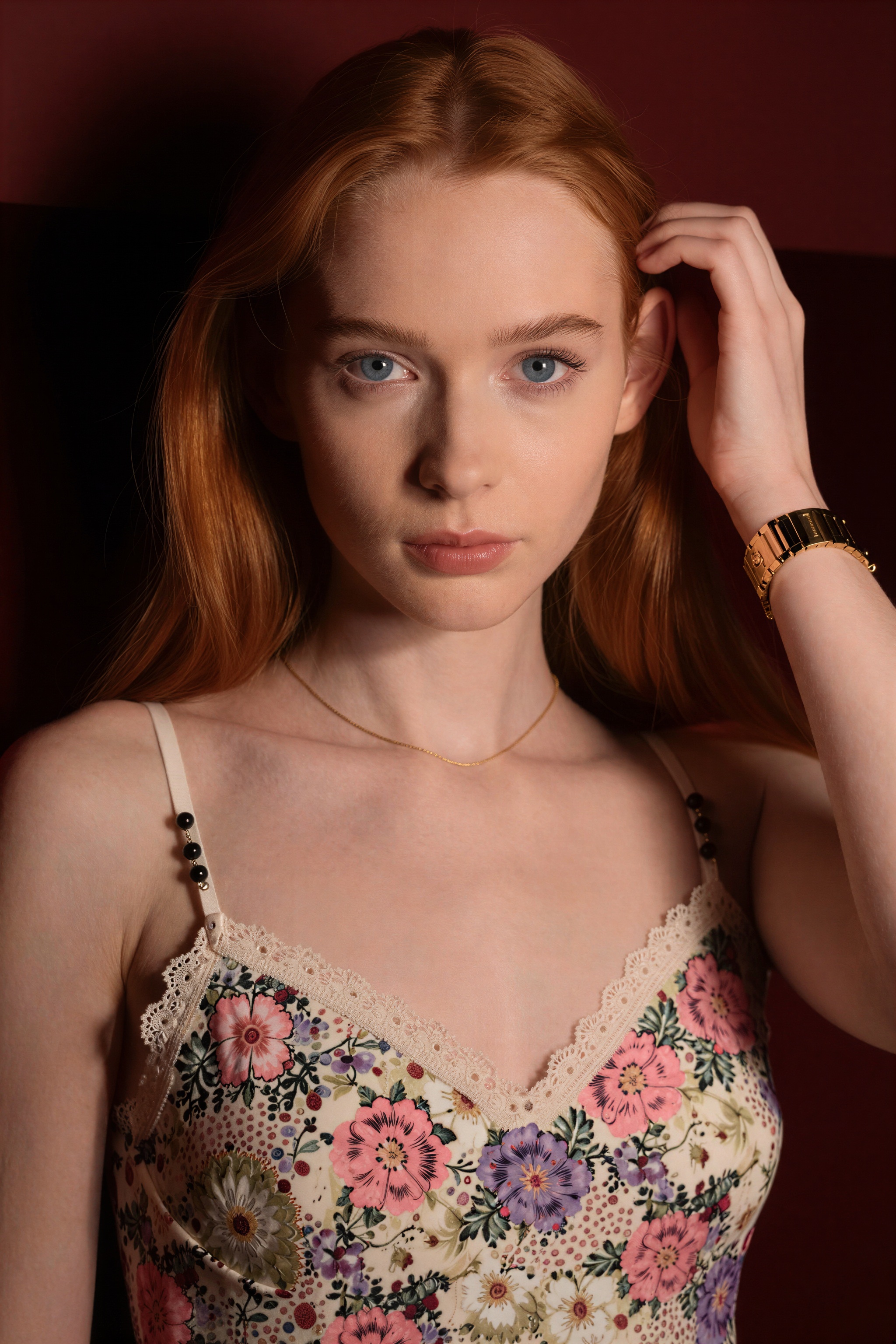 赤褐色の長い髪と印象的な青い目をした若い女性が、穏やかで中性的な表情で視聴者をまっすぐに見つめています。彼女は色白の肌をしており、彼女の特徴を強調する微妙な化粧をしています。彼女はカメラから少し離れて左側を見ながら、右手で頭をそっと触れます。この画像は、彼女の上半身を中心に、目の高さから親密なクローズアップで彼女を捉えています。彼女は、エッジに沿って繊細なレースのトリムが付いた、目立つピンク、紫。。高画質でフリーのNightStock素材です。商用利用可能・クレジット表記不要。
