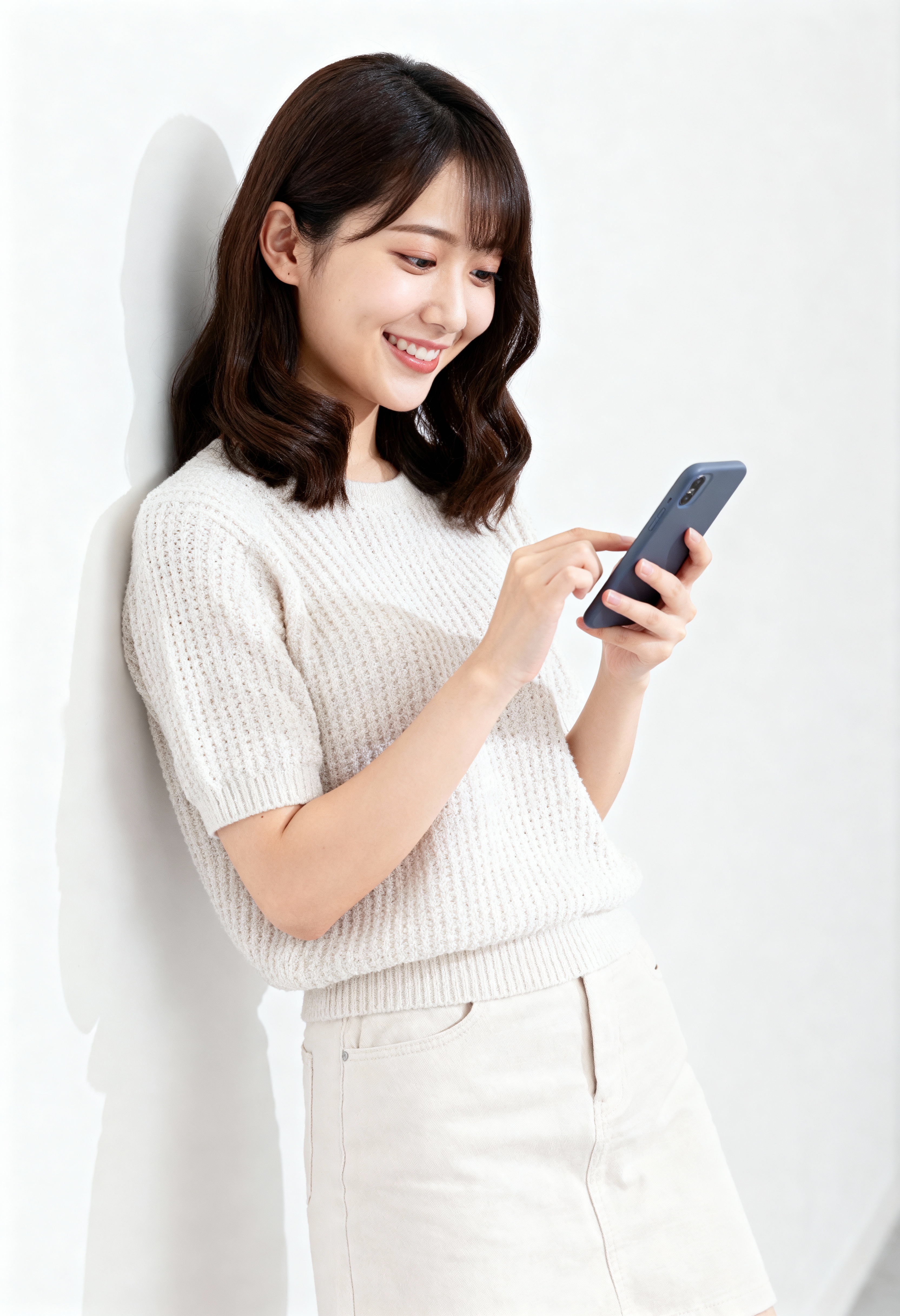 真っ白な壁に立ち、スマートフォンを持ちながら微笑む若い女性を正面カメラのアングルから写実的に撮影したもの。画像には、白いニットセーターと白いコーデュロイスカートを着た女性が画像の中央に立っていることも示されています。女性の右側、後ろの壁に影が落ちています。彼女は右手に黒いスマートフォンを持ち、満足そうな笑顔でそれを見つめています。女性はウェーブのかかった濃い茶色の長い髪をしていて、アジア系のように見えます。彼女は目を閉じており、顔にはわずかに笑みを浮かべています。彼女の体はスリムで、最小限の服を着ています。背景は無地の白で、照明は柔らかく自然で、クリーンでミニマルな外観を作り出しています。