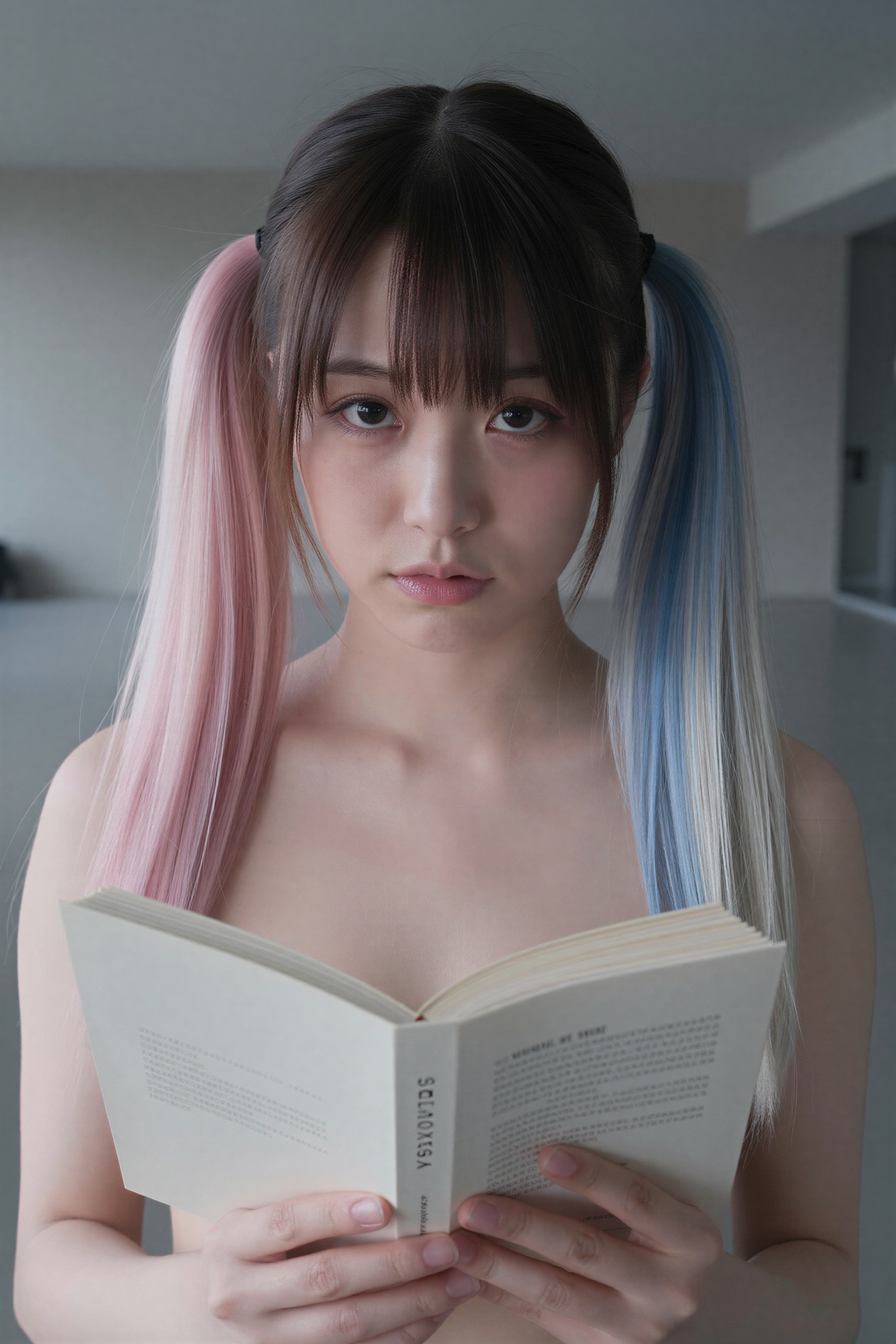 若々しいアジア人の顔立ちが、ぼやけた建築のラインを背景に、柔らかく照らされたモダンな屋内空間に立っています。彼女はツインテールにまとめた長いストレートヘアを持っています。片側はパステルピンクに色あせて白に、もう一方はブルーに色あせて白に染められており、どちらも黒い前髪と微妙なハイライトがアクセントになっています。大きく表情豊かな瞳は、穏やかで少しお茶目な表情で見る者をまっすぐに見つめています。エレ。。高画質でフリーのNightStock素材です。商用利用可能・クレジット表記不要。