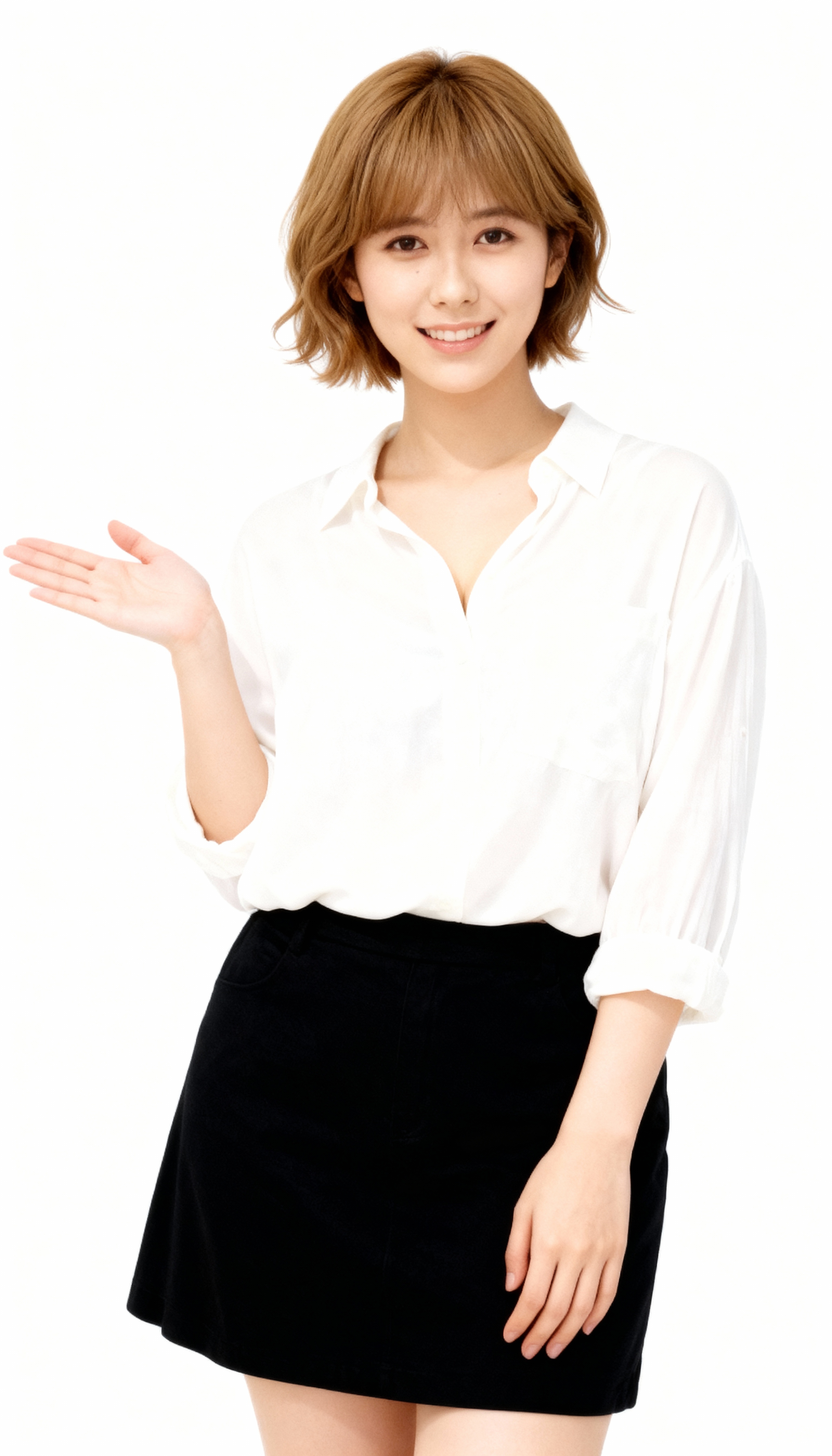 画像の中央に立ち、右手で友好的なジェスチャーを示している若いアジア人女性。彼女はVネックの白いブラウスと、膝のすぐ上にある短いスカートである黒いスカートを着ています。女性は前髪のあるボブカットに整えられた茶色の短い髪を持ち、歯を見せて満面の笑みを浮かべている。彼女の目は視聴者をまっすぐに見つめており、顔にはわずかに笑みを浮かべています。背景は無地の白で、画像にクリーンでシンプルな背景を提供します。画像は正面カメラの角度から撮影されており、見る人は女性の全身を詳細に見ることができます。