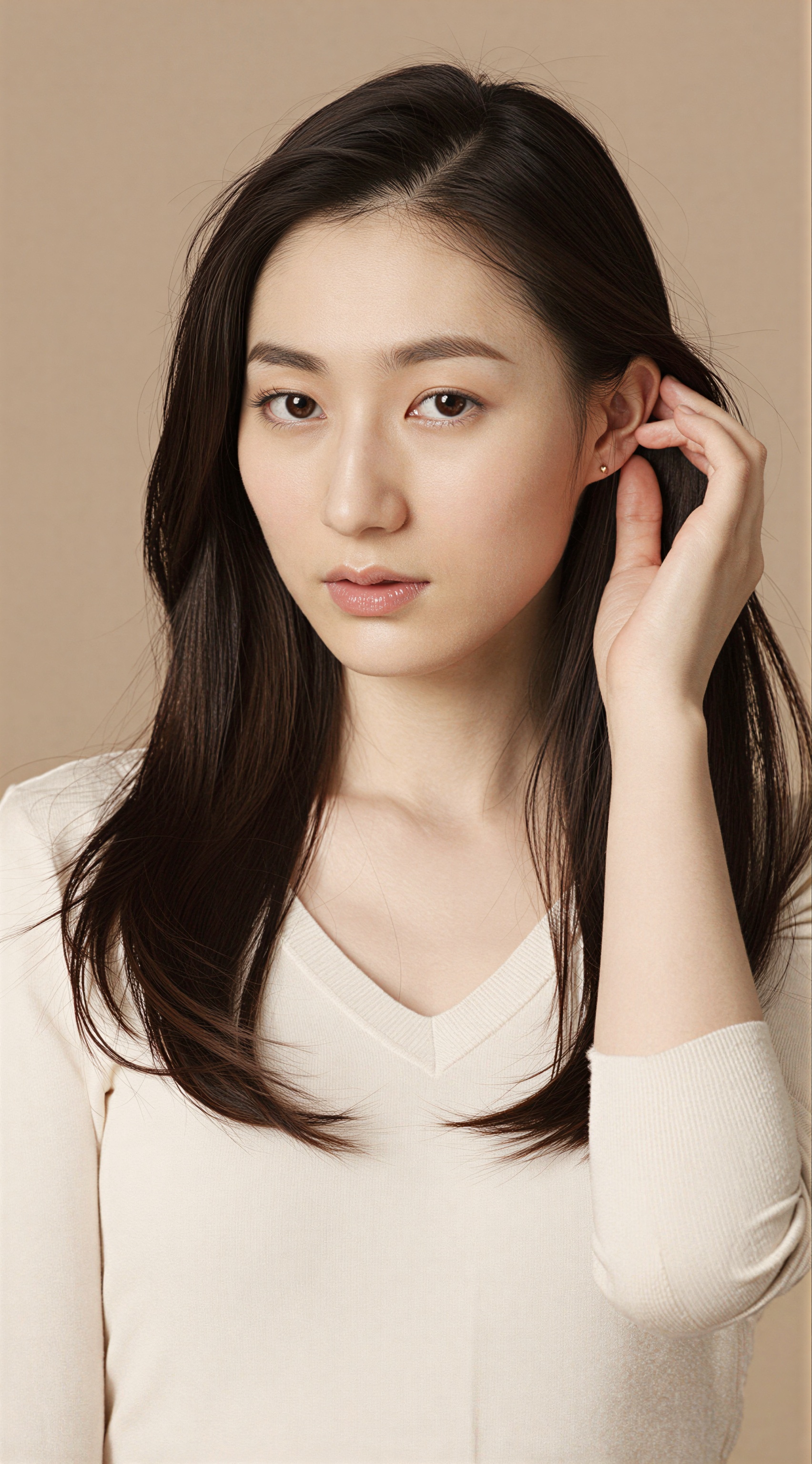 美しい日本女性。柔らかなニュートラルベージュの背景に、若い日本人女性が落ち着いたエレガントなポートレートで立っています。彼女の長い濃い茶色の髪は自然に肩の上に流れ、中心から少し離れて分けられ、右手は耳の近くの頭の側面にそっと触れ、繊細なスタッドイヤリングに注目を集めています。シンプルで上品なクリーム色のVネックセーターを着ており、すっきりとした控えめなスタイルを披露しています。生地は柔らかくて柔ら。。高画質でフリーのNightStock素材です。商用利用可能・クレジット表記不要。