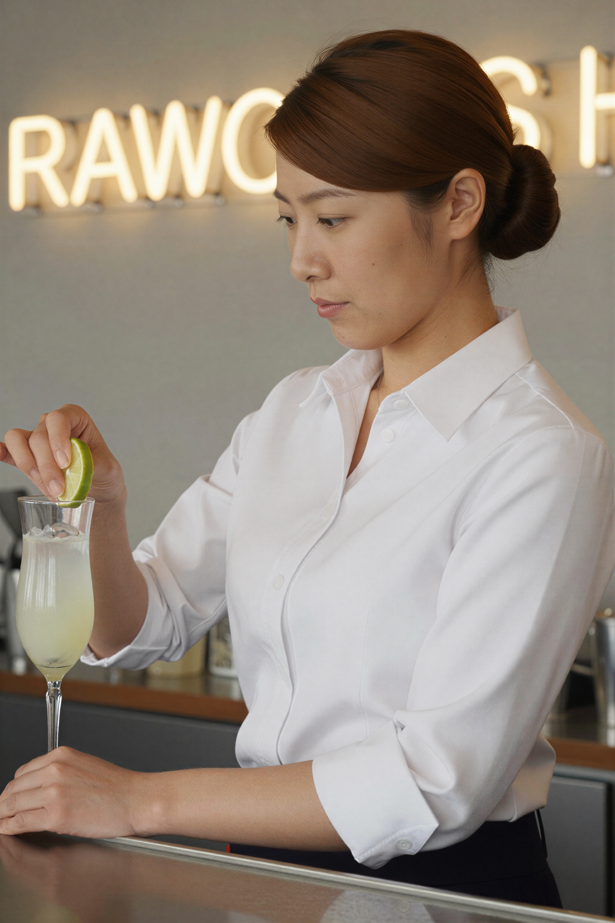 カクテルにライムを飾り、袖をまくった白いシャツを着た日本人女性バーテンダー、後ろにネオンバーの看板。高画質でフリーのNightStock素材です。商用利用可能・クレジット表記不要。