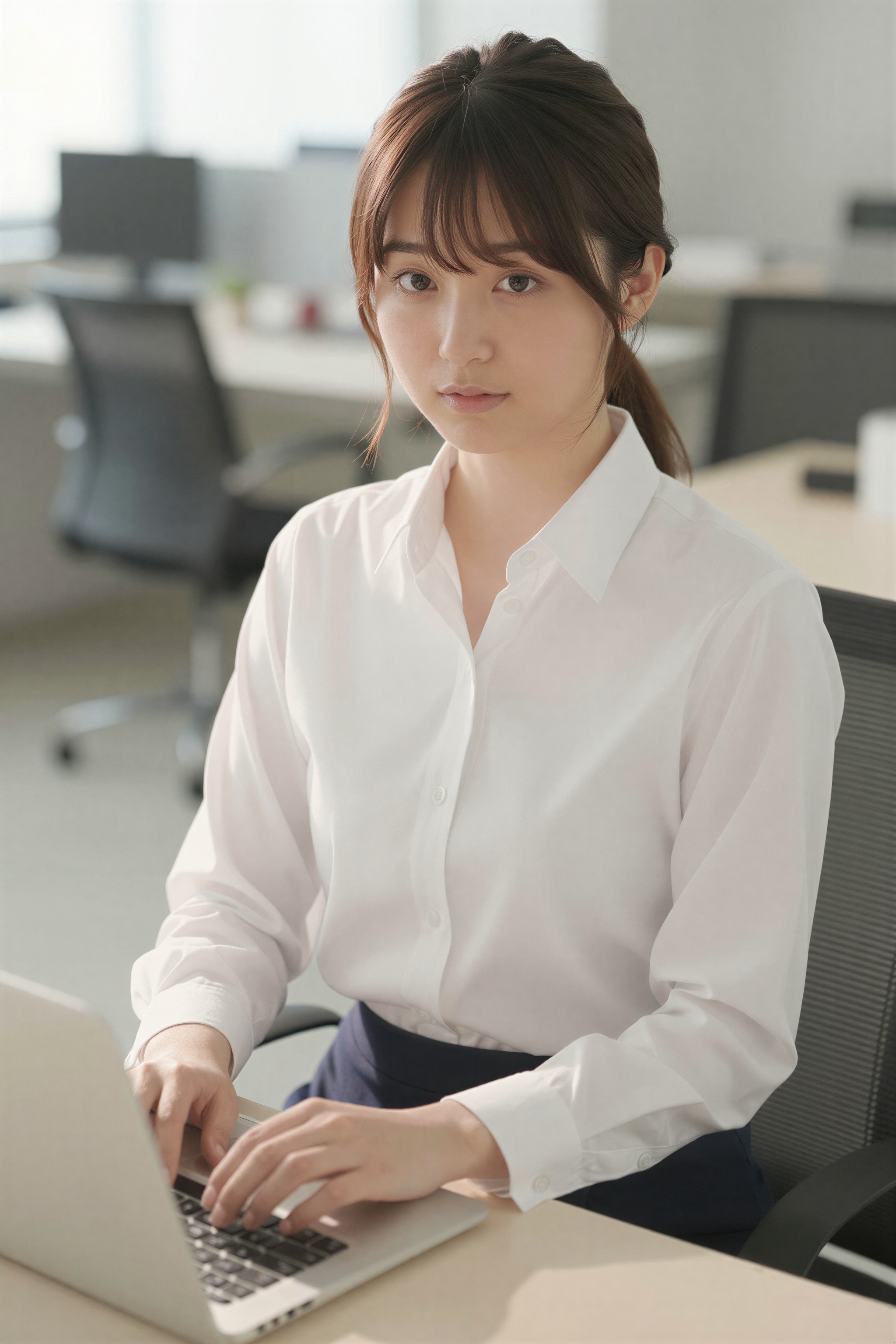 白いブラウスとネイビーのスカートを着て、ラップトップを持ってデスクにいる日本人女性会社員、明るいオフィス。高画質でフリーのNightStock素材です。商用利用可能・クレジット表記不要。