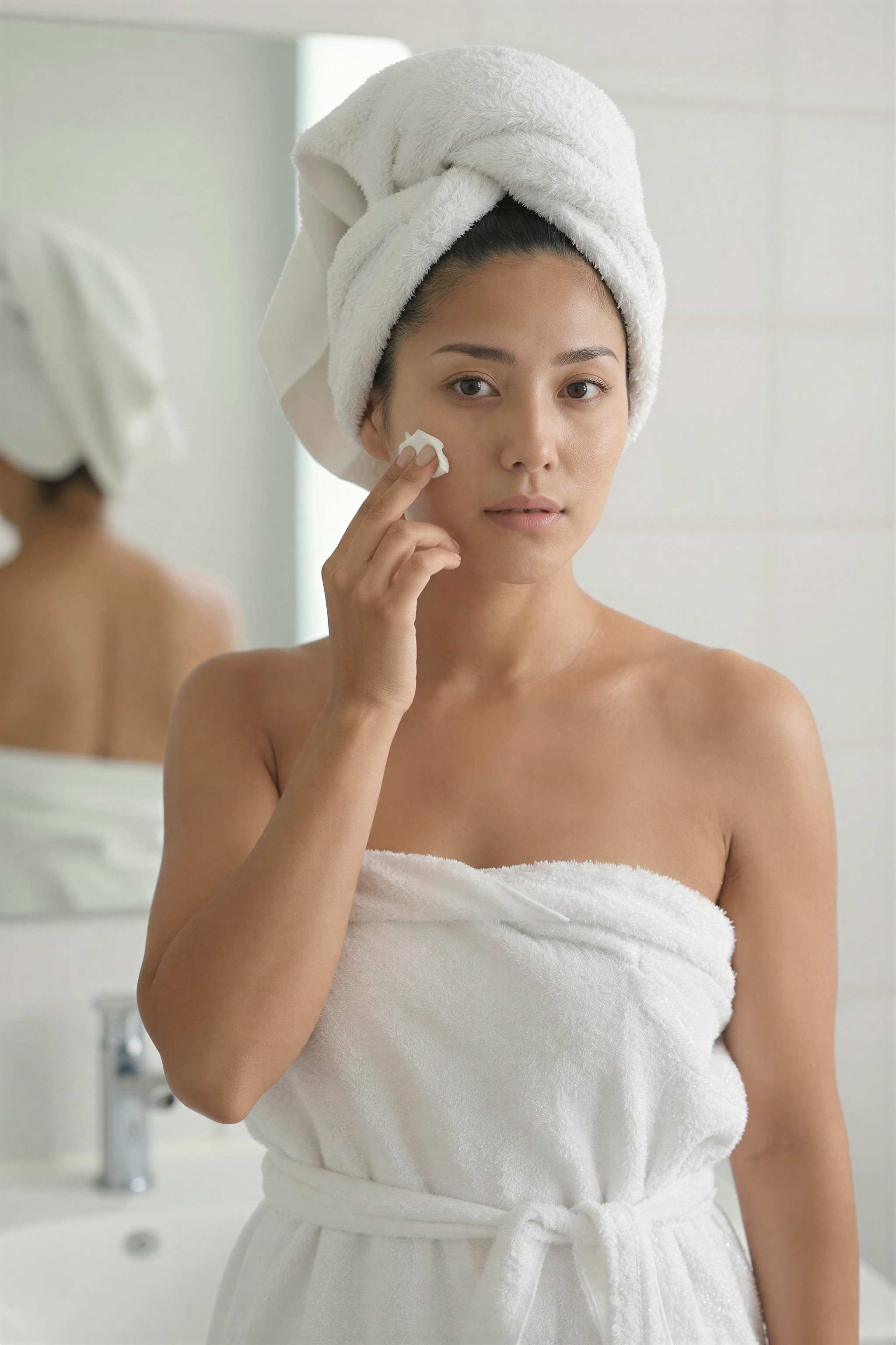 髪にタオルを巻いてスキンケアをし、バスローブを着て、明るいバスルーム、鏡、製品を着ている日本人女性。高画質でフリーのNightStock素材です。商用利用可能・クレジット表記不要。