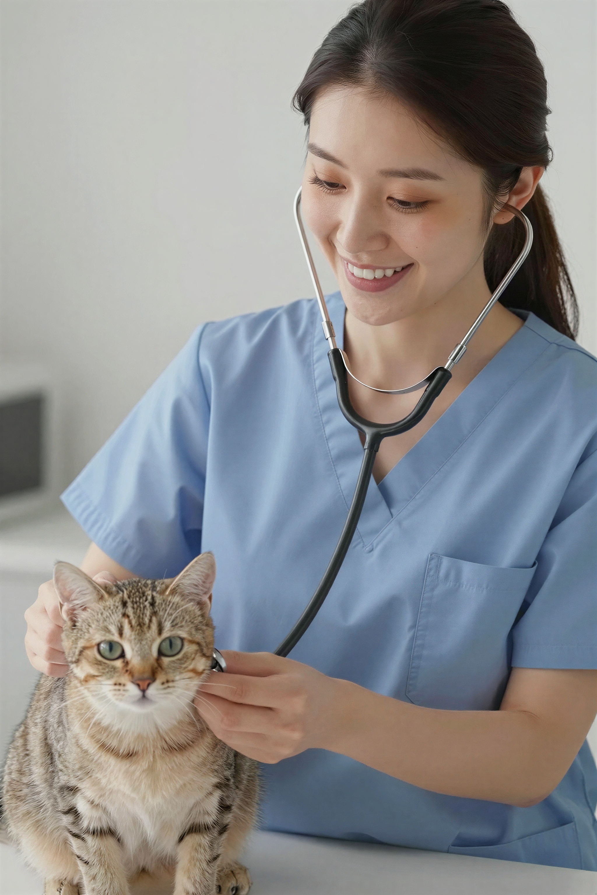 ペットの猫を診察する日本人女性獣医師、スクラブと聴診器を着用、清潔な動物病院、優しい手。高画質でフリーのNightStock素材です。商用利用可能・クレジット表記不要。