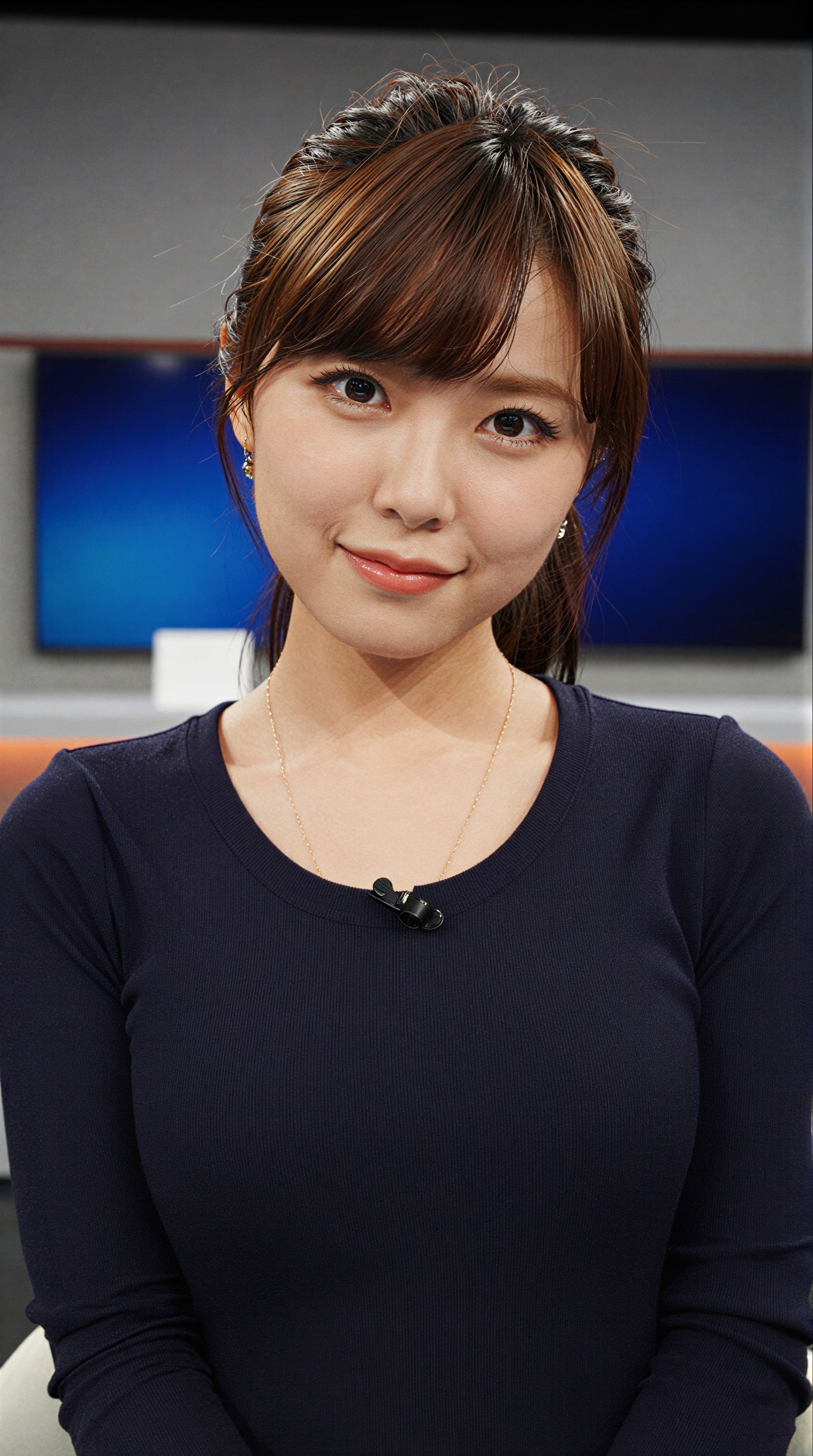 美しい日本人女性、若い日本人女性がテレビスタジオに座り、柔らかく心地よい笑顔とまっすぐで魅力的な視線でカメラに向かっています。彼女の茶色の髪は、顔を縁取るうっすらとした前髪のあるきちんとしたアップヘアにスタイリングされており、光をキャッチする小さなぶら下がりイヤリングを付けています。彼女は、微妙なウールのパターンが施されたダークネイビーブルーの長袖トップを着ており、丸いネックラインと胸の中央近くに。。高画質でフリーのNightStock素材です。商用利用可能・クレジット表記不要。