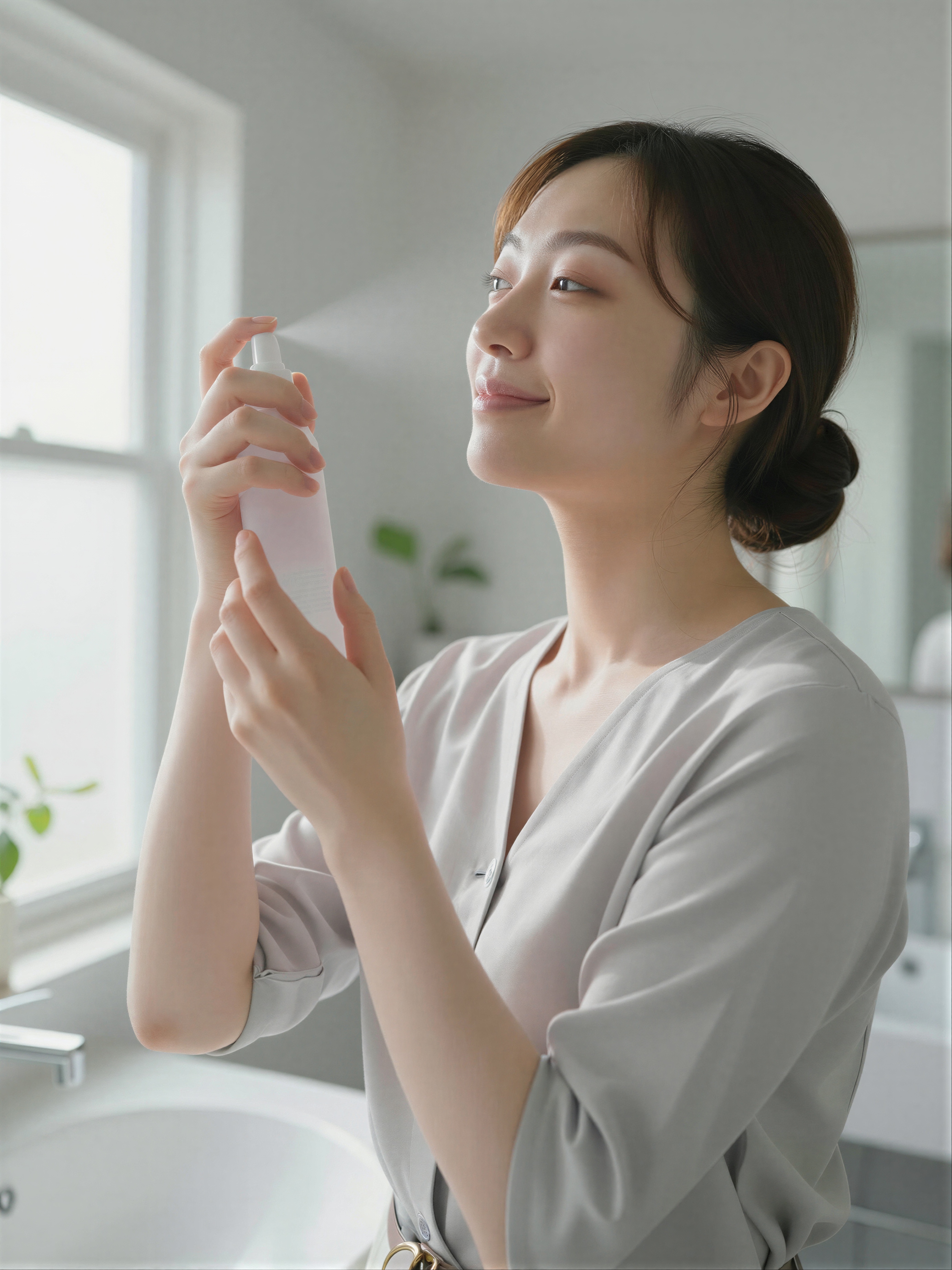 大理石のカウンタートップと緑の植物のある明るくモダンなバスルームにいる日本人女性は、控えめでエレガントなライトグレーのブラウスを着て、フェイシャルミストの小瓶を持ち、顔に向かって細い弧を描くように噴射しています(顔は横から部分的に見えています)。穏やかでさわやかな表情をしています。大きな窓からさわやかな朝の光が店内を照らします。。高画質でフリーのNightStock素材です。商用利用可能・クレジット表記不要。