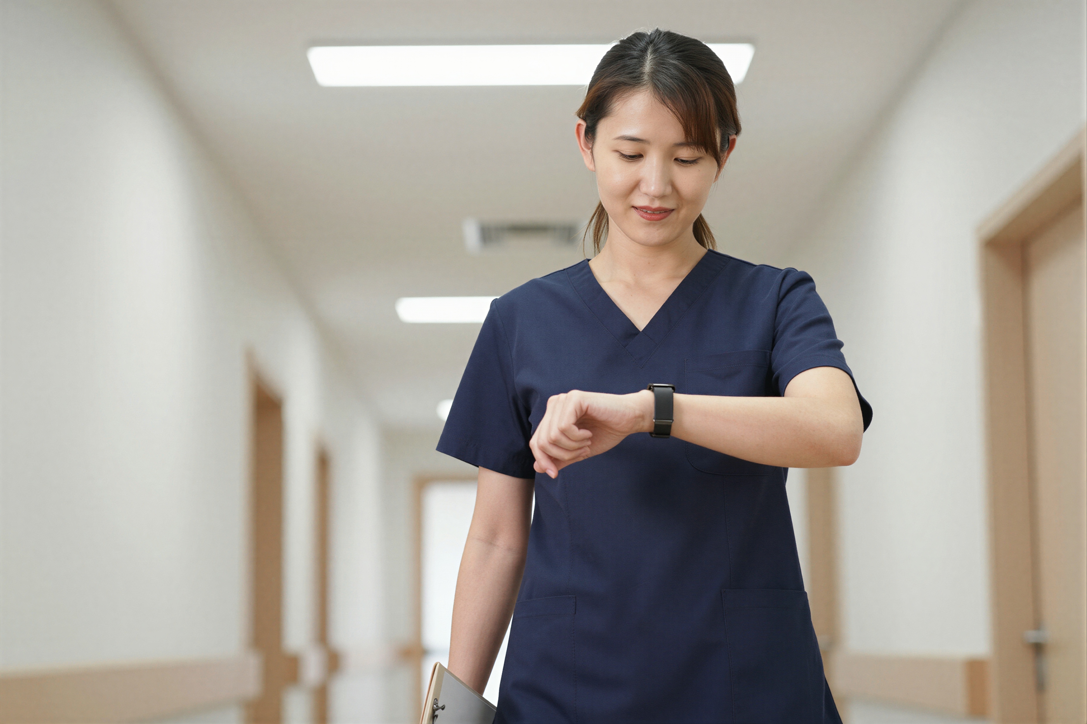 濃いネイビーブルーの医療用スクラブを着て、少し心配しながらも集中した表情で手首のスマートウォッチを見ながら、医療用クリップボードを持ち、病院の廊下を意図的に歩いている日本人女性。明るい頭上の照明。。高画質でフリーのNightStock素材です。商用利用可能・クレジット表記不要。