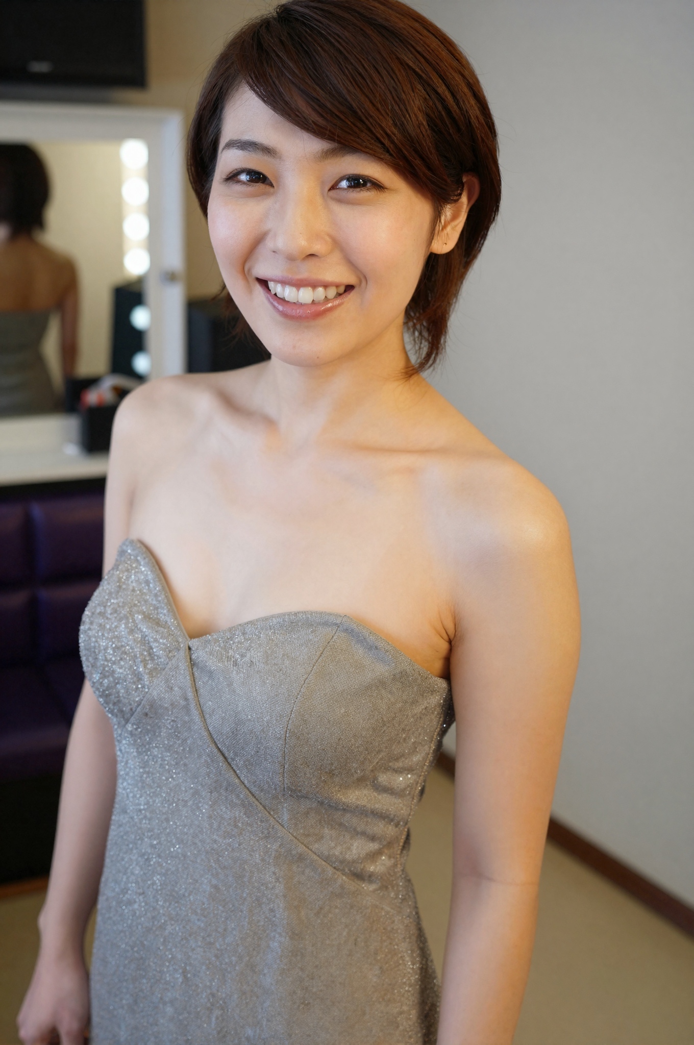 革張りの椅子と色付きの照明が備わった高級カラオケルームに、きらめく銀色のスパンコールのドレスを着たプロの日本人女性が立っており、化粧台の鏡で化粧をしており、舞台裏の採用活動の雰囲気があり、顔には温かみのある照明が当てられ、フレームの上部が部分的に切り取られており、テキスト、文字、数字、書き込み、透かしは一切含まれていない。高画質でフリーのNightStock素材です。商用利用可能・クレジット表記不要。