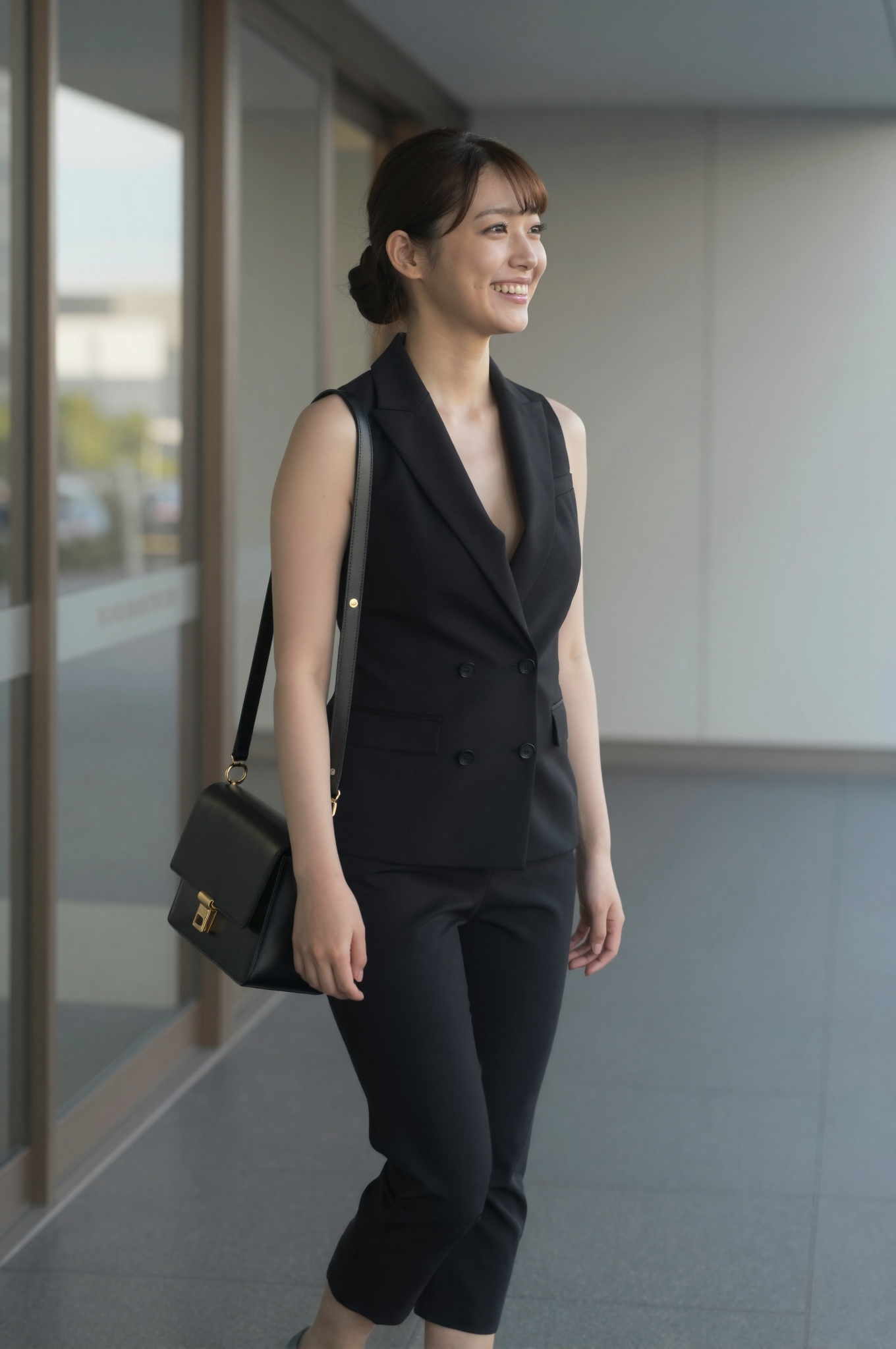 通勤用のトレンディーなカジュアルウェアを着た日本人女性が、バッグを肩にかけて入り口付近に立っており、リラックスしているがプロフェッショナルな外観、ガラスのドアに映る明るい朝の空、清潔で整理整頓されたロビーエリア、スタイリッシュなアクセサリー、自信に満ちた笑顔、スタッフの普段着の雰囲気、素肌ではない。高画質でフリーのNightStock素材です。商用利用可能・クレジット表記不要。