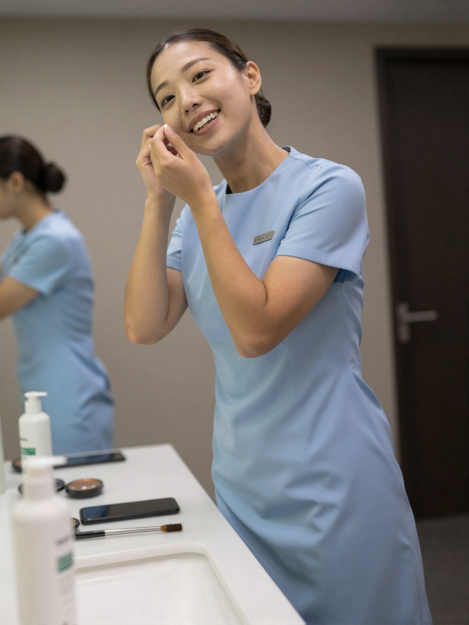 清潔な制服風の水色のドレスを着た20代の美しい日本人女性が化粧室で身支度をしている。彼女の口の部分は微妙にぼかされており、鏡で自分の外見を調整している間、彼女は集中していてプロフェッショナルに見えます。プロ仕様の照明が彼女の顔を照らし、カウンターにはさまざまな美容用品が整然と並べられている。プロフェッショナルなサービスをイメージし、清潔感と働きやすさを重視したお部屋です。。高画質でフリーのNightStock素材です。商用利用可能・クレジット表記不要。