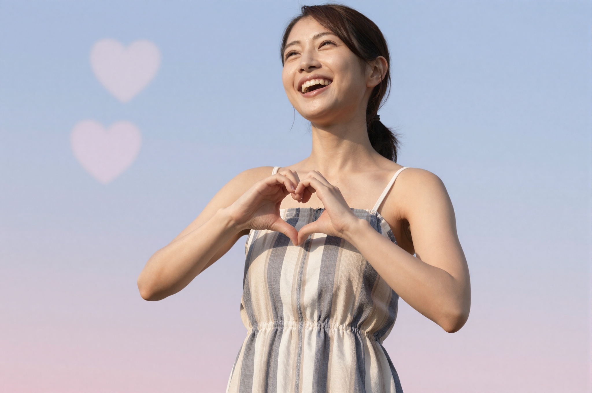 明るい水色からピンクのグラデーション背景の右端に美しい日本人女性が配置されており、ハートのボケ味のオーバーレイで微妙に強調されています。彼女は胸の近くでハートマークを作り、顔の上部を部分的にトリミングして、トレンディーなカジュアルドレスを着た若々しいファッションを強調しています。雰囲気は明るく魅力的で、陽気なパステルカラーパレットを使用しており、テキスト、文字、数字、書き込み、透かしは一切ありませ。。高画質でフリーのNightStock素材です。商用利用可能・クレジット表記不要。