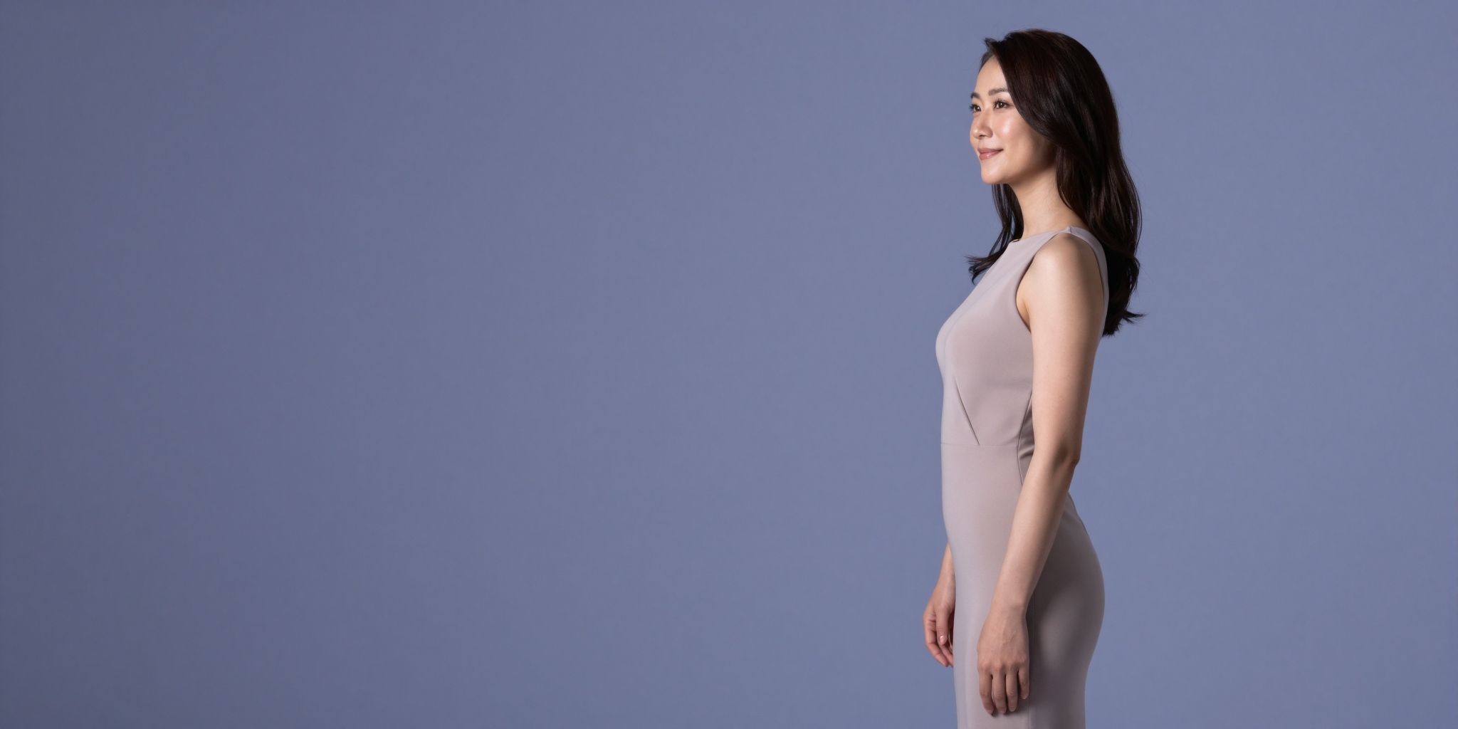 華やかなカクテルドレスを着た美しい日本人女性が右端に立っているが、20%しか見えていない。残りの 80% は、きれいな深い青から暗いグラデーションの背景で、力強いテキスト オーバーレイに最適です。彼女の表情は自信に満ちていて、野心的です。テキスト、文字、数字、書き込み、透かしは一切ありません。高画質でフリーのNightStock素材です。商用利用可能・クレジット表記不要。
