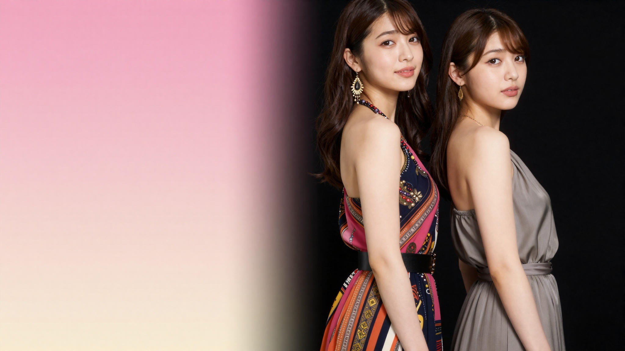 右側には、ステートメントジュエリーを付けたファッショナブルなクラブウェアを着た2人の美しい若い日本人女性が、明るいエネルギーのあるテーマの衣装を着て、顔の一部が見え、穏やかな紙吹雪と輝きのオーバーレイによるお祝いのピンクからゴールドのグラデーションを背景にしている。左側には50%のテキストスペースがあり、テキスト、文字、数字、書き込み、透かしは一切含まれていない。高画質でフリーのNightStock素材です。商用利用可能・クレジット表記不要。