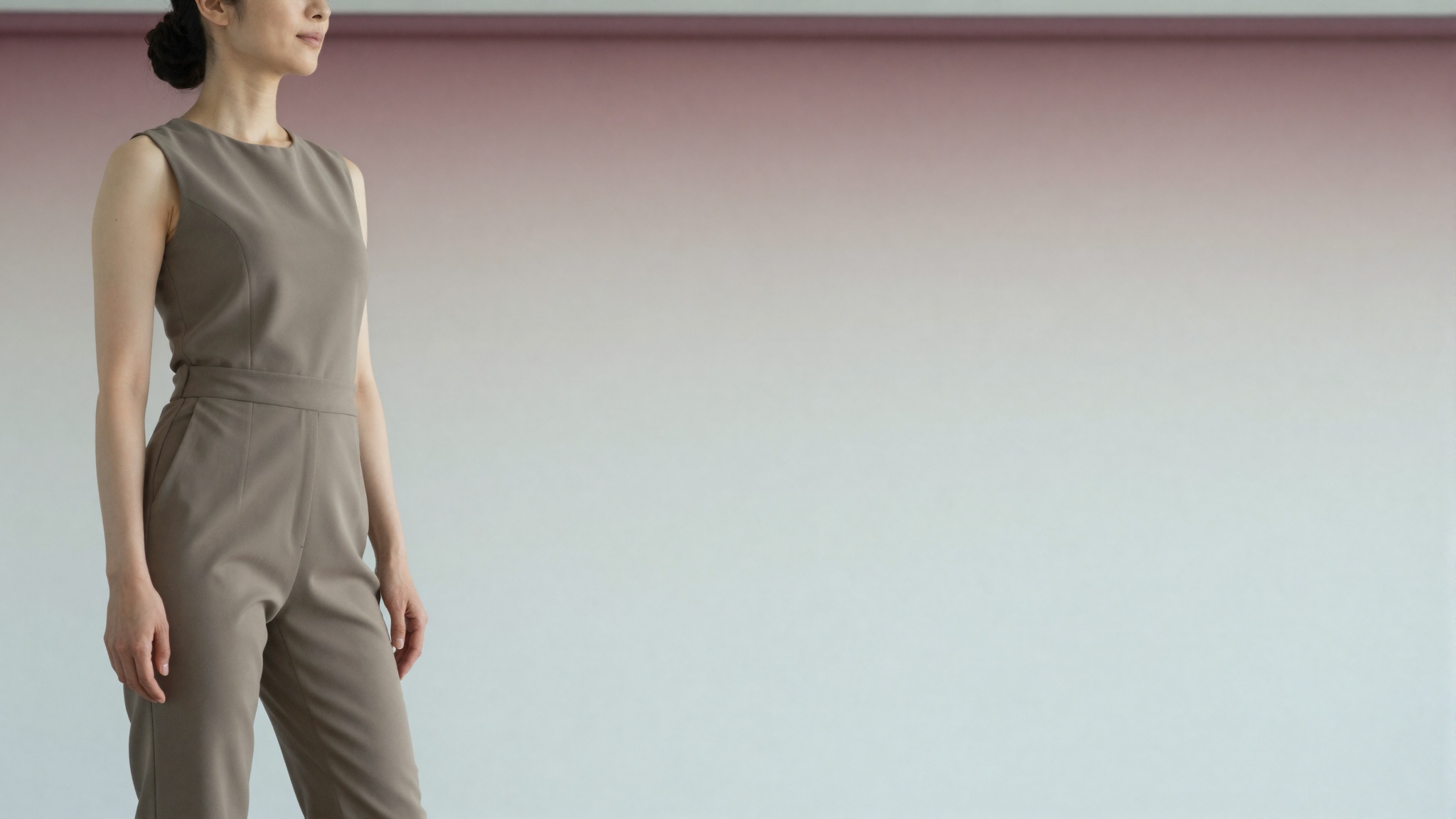 ラウンジ募集用の洗練されたバナー。落ち着いたバーガンディからクリーム色のグラデーションと洗練された幾何学模様でデザインされています。女性は右を向いて左端に位置し、髪をエレガントに上げて首を見せ、顔を隠し、右側にテキストスペースを確保しています。彼女は、現代的な成熟を反映したアースカラーのエレガントなジャンプスーツを着ています。柔らかな間接光に照らされた、静かで洗練された雰囲気が漂います。。高画質でフリーのNightStock素材です。商用利用可能・クレジット表記不要。