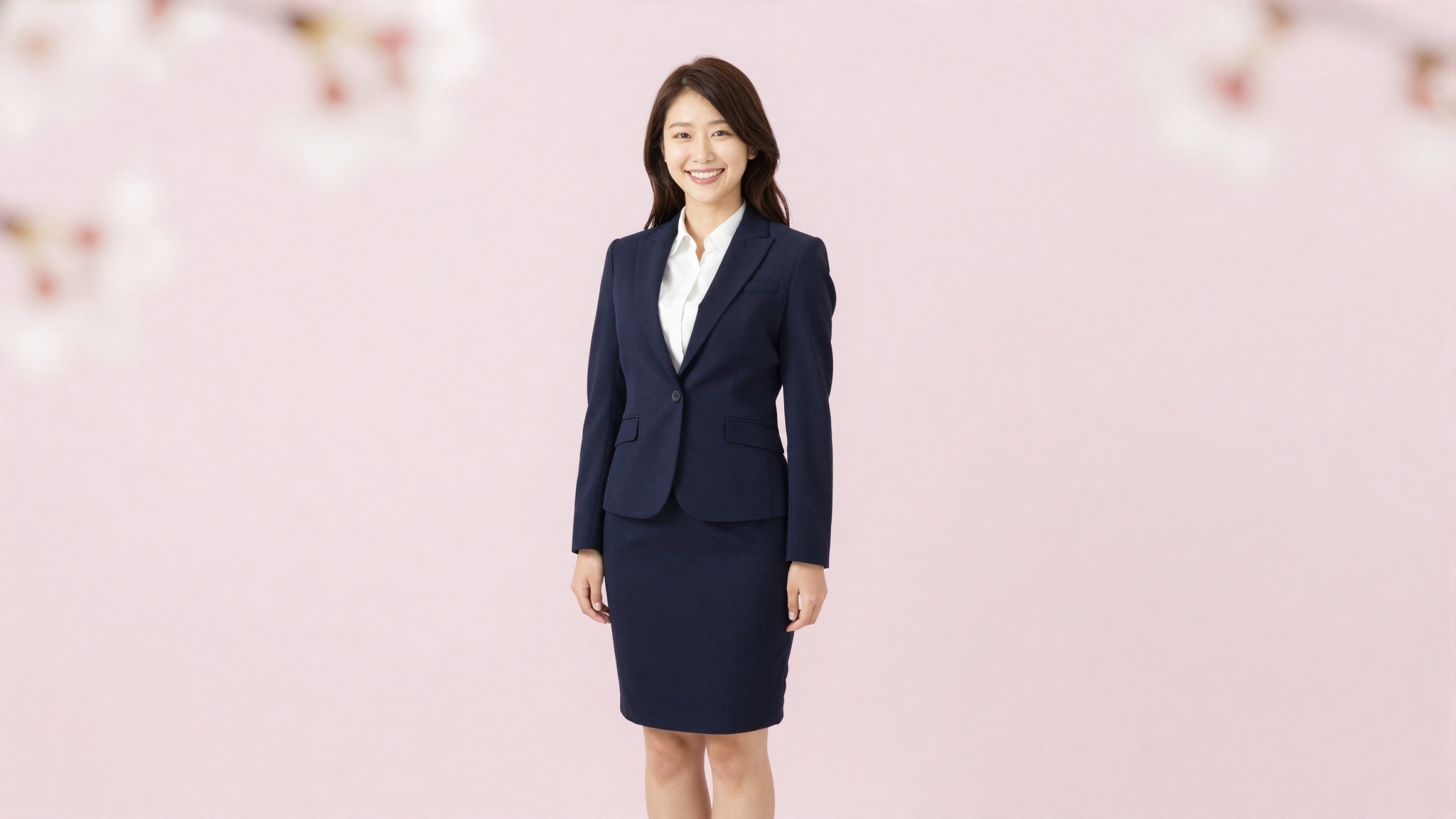 右側の美しい日本人女性は、紺色のスカートスーツに白いブラウスを着て自信に満ちた立ちポーズをとっており、清潔で信頼できるイメージを伝えています。背景は、桜の花びらが散りばめられた温かみのあるピンクのグラデーションで、柔らかな金色の輝きがあり、文字、文字、数字、書き込み、透かしは一切ありません。。高画質でフリーのNightStock素材です。商用利用可能・クレジット表記不要。