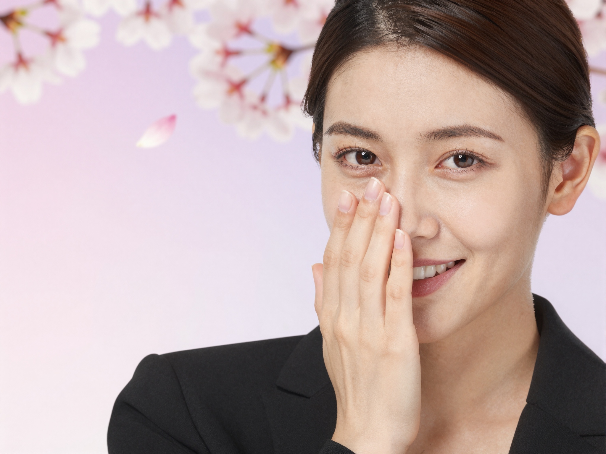 右端には美しい日本人女性が恥ずかしそうに下顔を手で覆い、微笑んだ目が見える。彼女は黒のフォーマルなビジネススーツを着ており、プロ意識がにじみ出ています。背景はエレガントなピンクから紫のグラデーションで、優雅に浮かぶ桜の花びらと温かみのある金色の光のフレアによって強調され、洗練された野心的な雰囲気を作り出しています。テキスト、文字、数字、書き込み、透かしは一切ありません。。高画質でフリーのNightStock素材です。商用利用可能・クレジット表記不要。