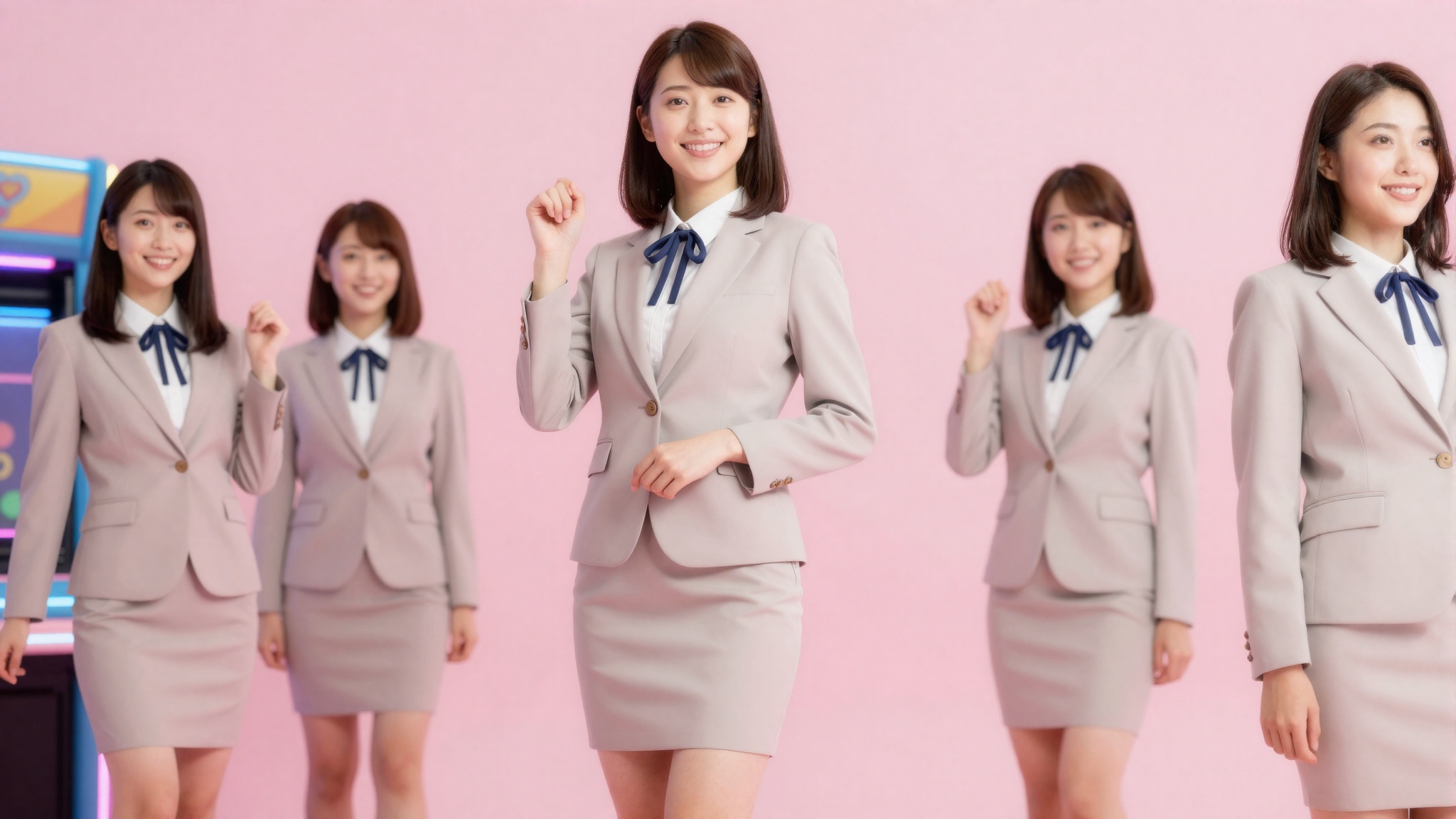 ブレザーとリボンが付いたおそろいのOLのコスプレをした日本人女性3人組が、明るく元気な雰囲気でポーズをとっている。これらは、ゲームとエンターテイメントのテーマが目に見えるカラフルなネオンに照らされたインテリアに配置されており、鮮やかなピンクの照明がシーンを照らしています。テキスト、文字、数字、書き込み、透かしは一切禁止。高画質でフリーのNightStock素材です。商用利用可能・クレジット表記不要。