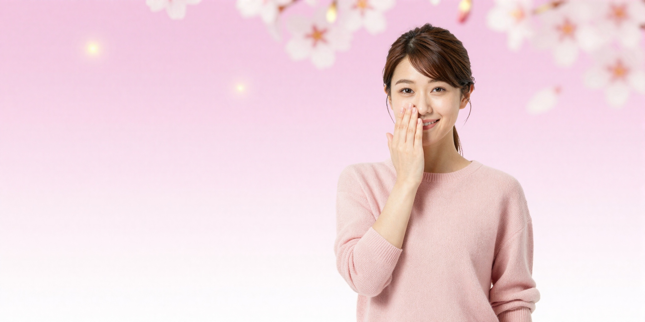 右端には美しい日本人女性が立っており、顔の下をそっと手で覆い、照れ笑いを浮かべており、その目は温もりに輝いている。彼女はカジュアルなピンクのニットウェアを着ており、柔らかくフェミニンな日常スタイルを体現しています。背景は上品なピンクから紫のグラデーションで、繊細に浮かぶ桜の花びらと温かみのある金色の光が全体に広がり、明るく女性らしい雰囲気を醸し出しています。ゴールドの輝きのアクセントが随所に散りば。。高画質でフリーのNightStock素材です。商用利用可能・クレジット表記不要。