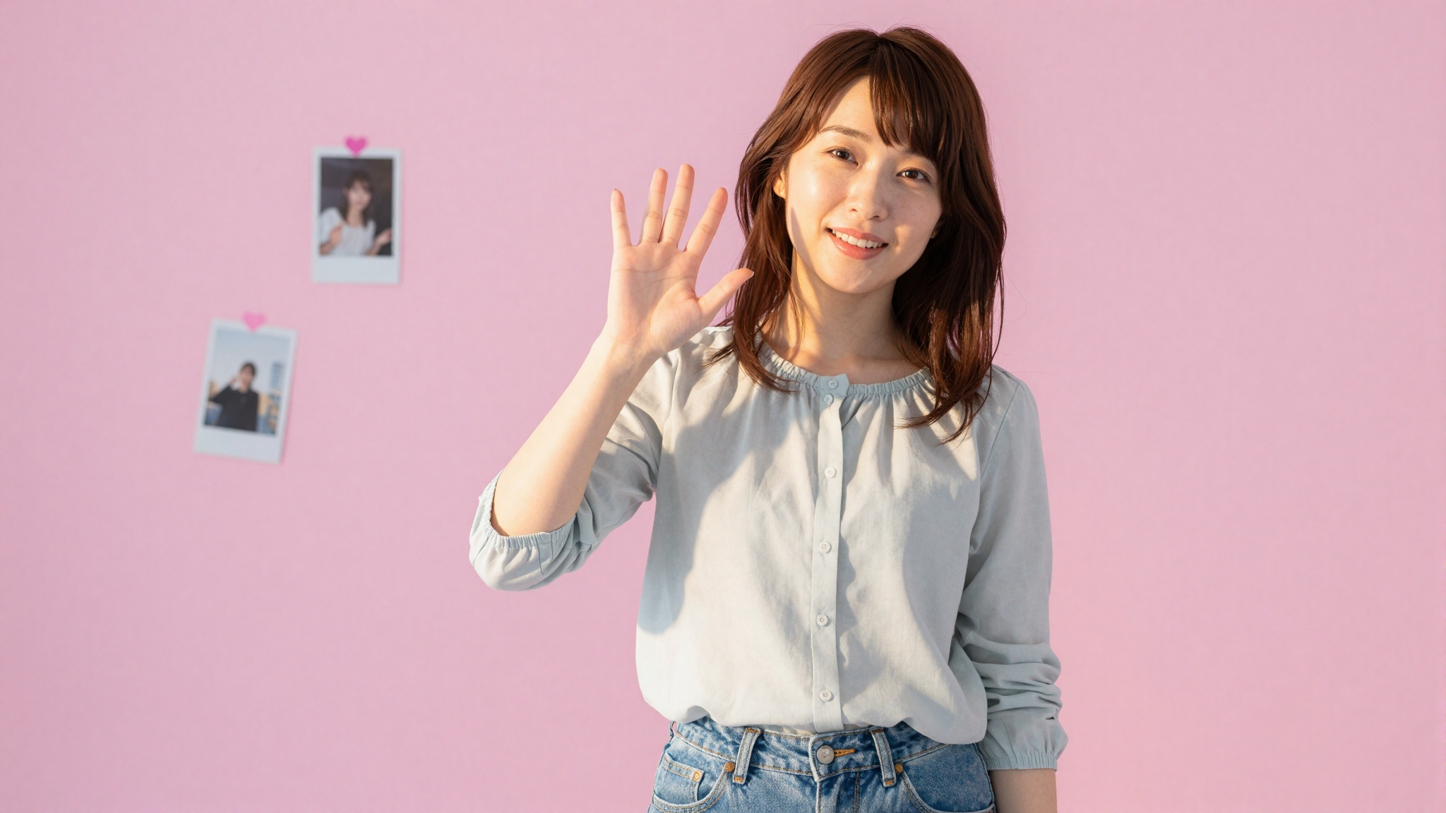 明るい笑顔を浮かべた美しい日本人女性が、カメラの方向にさりげなく手を振り、ストリーミングやチャットのポーズを体現しています。彼女はカジュアルなブラウスとジーンズを着ており、自然な日常のファッションを反映しています。背景は明るいパステルピンクで、ポラロイドフォトフレームの装飾とハートのアクセントがあり、遊び心と個性を演出しています。現場は活気に満ちた陽気な照明で照らされます。テキスト、文字、数字、書。。高画質でフリーのNightStock素材です。商用利用可能・クレジット表記不要。