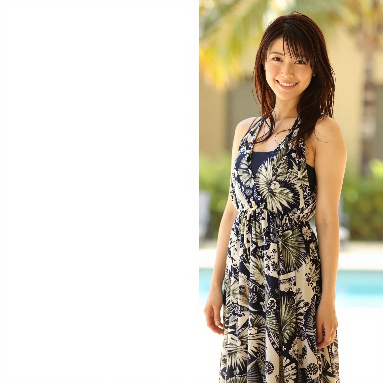 右側にはリゾートウェアのサンドレスを着た美しい日本人女性が豪華な雰囲気を漂わせ、華やかな到着の雰囲気を漂わせています。彼女の背後にある明るい金色の背景は、高級リゾートのプールサイドを思わせるトロピカルな雰囲気を作り出し、休暇のライフスタイルを強調しています。画像の左半分はテキストが透明で、望ましい旅行体験を促進します。テキスト、文字、数字、書き込み、透かしは一切ありません。。高画質でフリーのNightStock素材です。商用利用可能・クレジット表記不要。