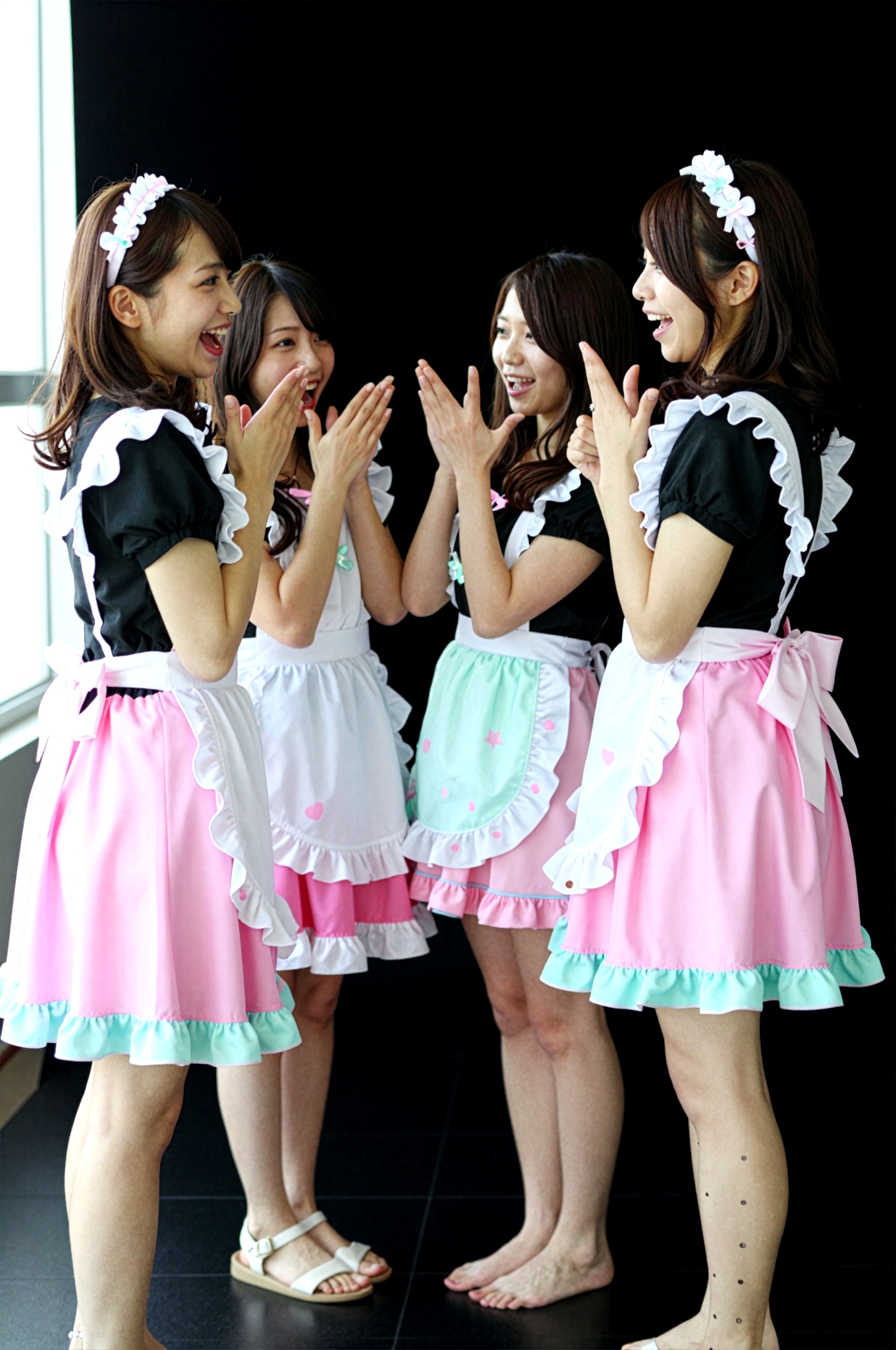 クラシックなフリルのメイド服を着た4人の元気な日本の女の子が、かわいい星とハートの模様の装飾が施された明るいパステルピンクからミントのグラデーションの中で、シンクロしてキュートなポーズをとります。場面は魅力的で陽気です。テキスト、文字、数字、書き込み、透かしは一切ありません。高画質でフリーのNightStock素材です。商用利用可能・クレジット表記不要。